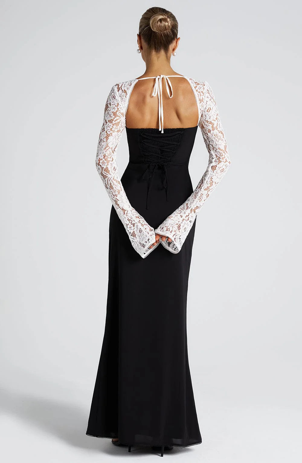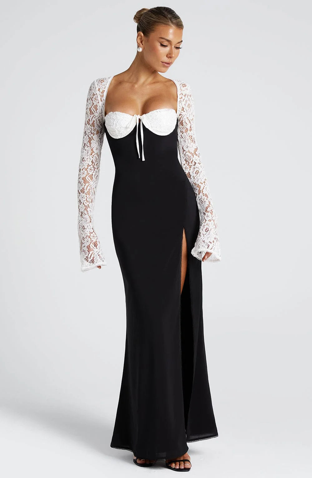 The Aria Maxi Dress in Black/White is the ultimate blend of elegance and allure. Designed to make a statement, this maxi length dress features contrast sheer lace sleeves with delicate picot edge trimming. The gathered lace overlay on the cups enhances the intricate detailing, while a thigh-high split brings a bold and sultry edge. Whether you're attending a glamorous evening event or a romantic dinner, Aria is designed to turn heads.