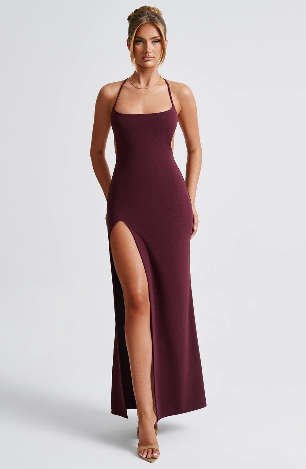 One for the date nights, late nights and beyond. Cut from our luxe crepe that stretches for a comfortable fit, Beatrix has a scoop neckline with a super low scoop back, cross over, adjustable straps and a thigh high split. Partner with cherry heels and go.