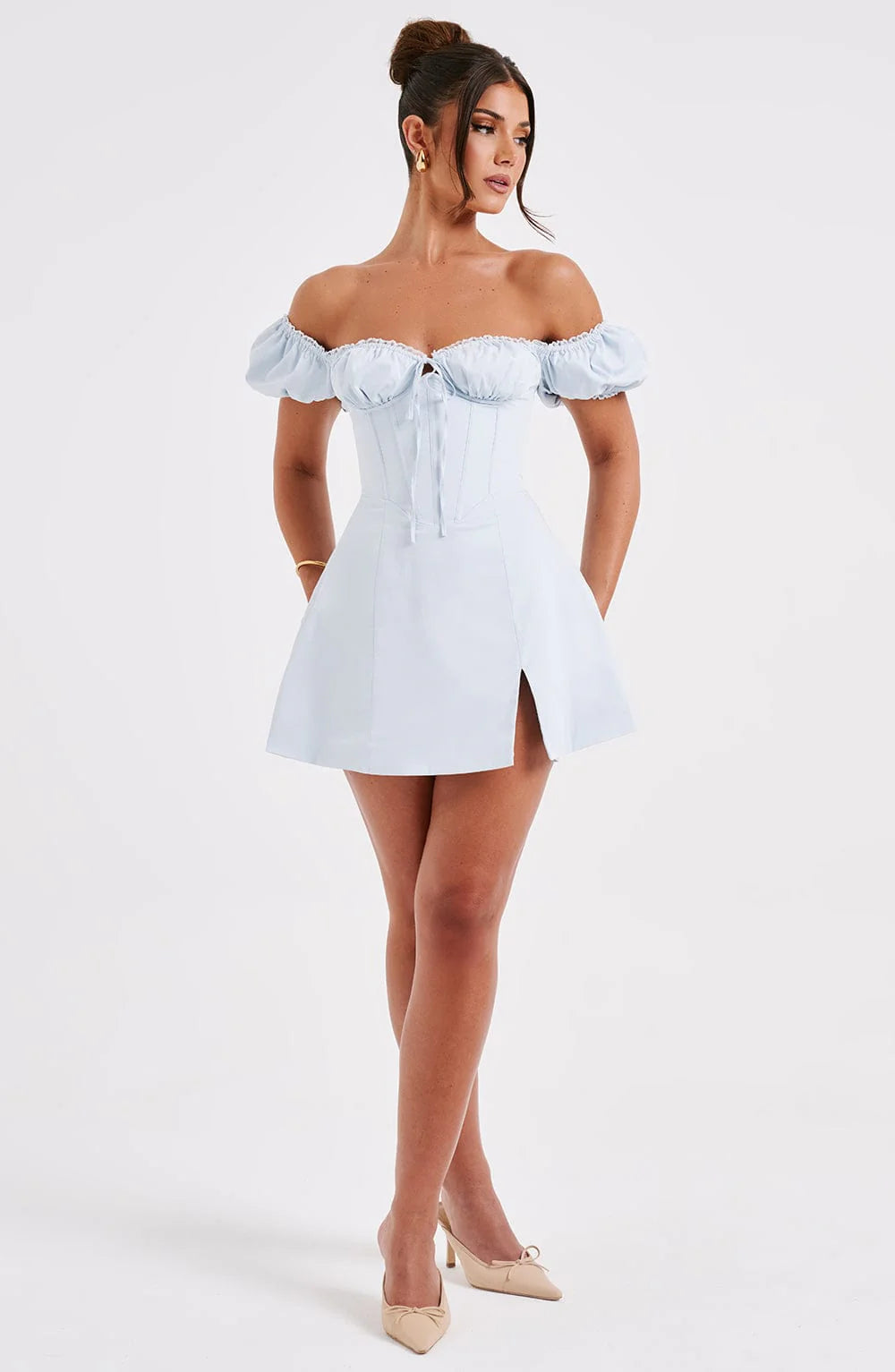 With a boned bodice and lace up back to cinch your waist, Caitlyn will see you through every event this season. Crafted in our lightweight cotton blend fabric, it has pretty puff sleeves, gathered, underwired cups and a floaty skirt shape. Partner with high heels and a mini bag.