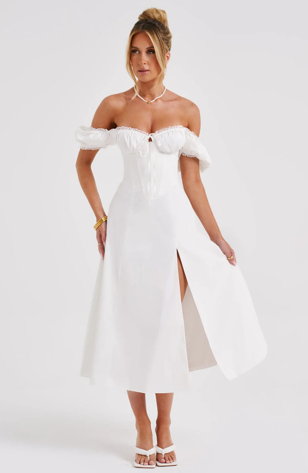 Must-have milkmaid midis are what we're wearing ALL season with sleek waves and mule heels. Courtney has dreamy puffed sleeves you can wear on or off the shoulders, with a snatched waist and pretty tie detail to the bust. The look is complete with a voluminous skirt and thigh high split.