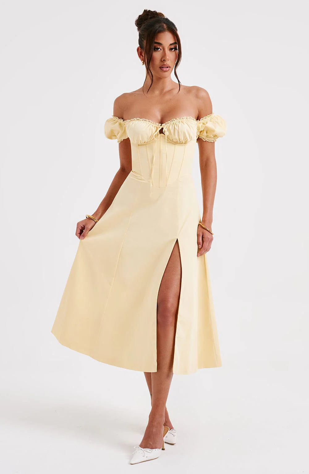 Must-have milkmaid midis are what we're wearing ALL season with sleek waves and mule heels. Courtney has dreamy puffed sleeves you can wear on or off the shoulders, with a snatched waist and pretty tie detail to the bust. The look is complete with a voluminous skirt and thigh high split.