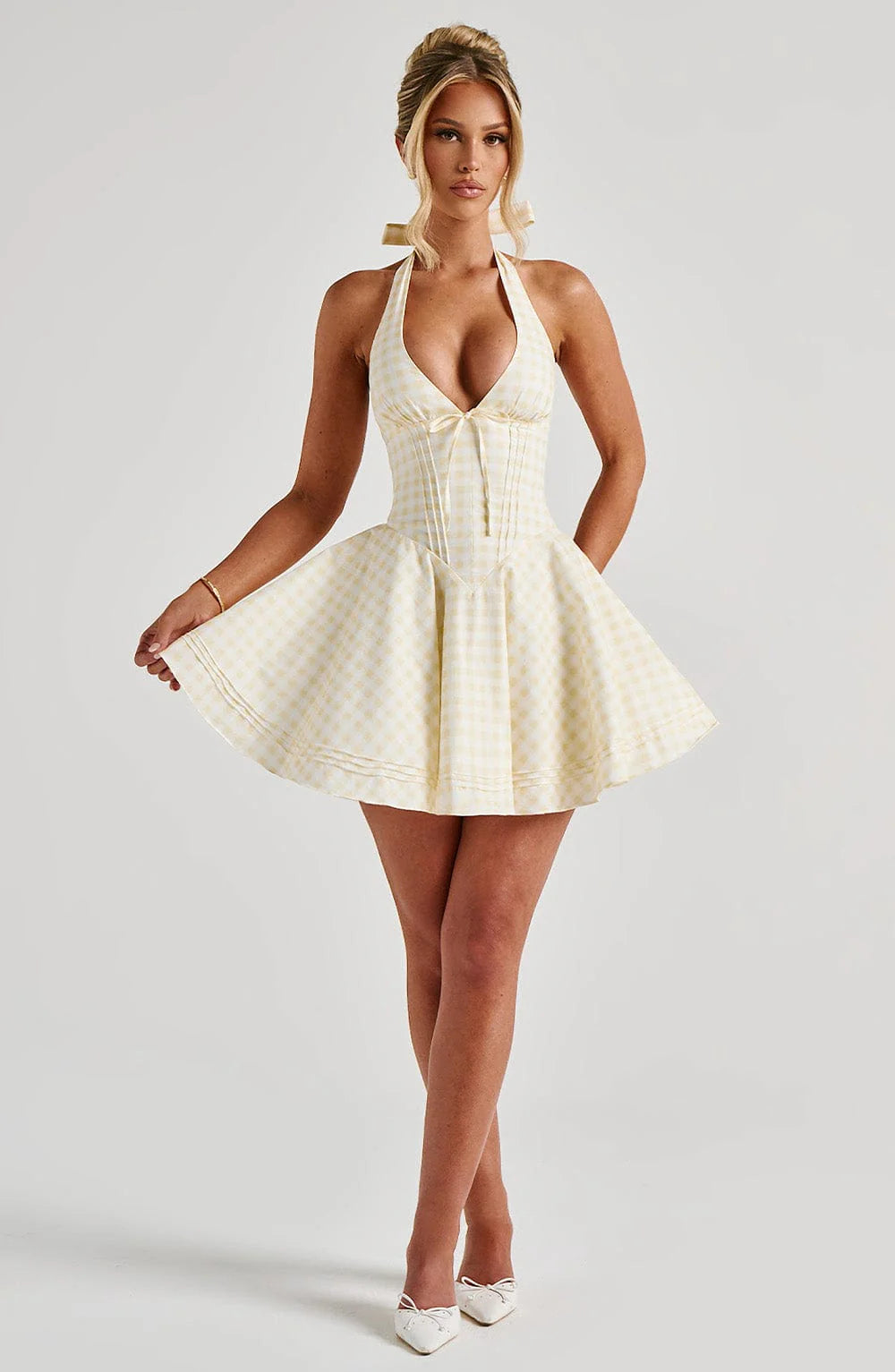 The perfect blend of playful elegance and modern charm, meet the Doris Mini Dress. In a fresh lemon gingham print, this dress is crafted from a soft cotton, nylon, and elastane blend for a comfortable, flattering fit. The mini length and plunge neckline with halter straps create a flattering silhouette, while the tie detail under the bust adds a delicate touch. Pintucks on the bodice and skirt edge and gathered cups enhance the dress's femininity. The full skirt is given extra volume with tulle attached to the lining, offering a dreamy, voluminous look. Ideal for a garden party or brunch, this dress can be styled with the for a coordinated, chic outfit.