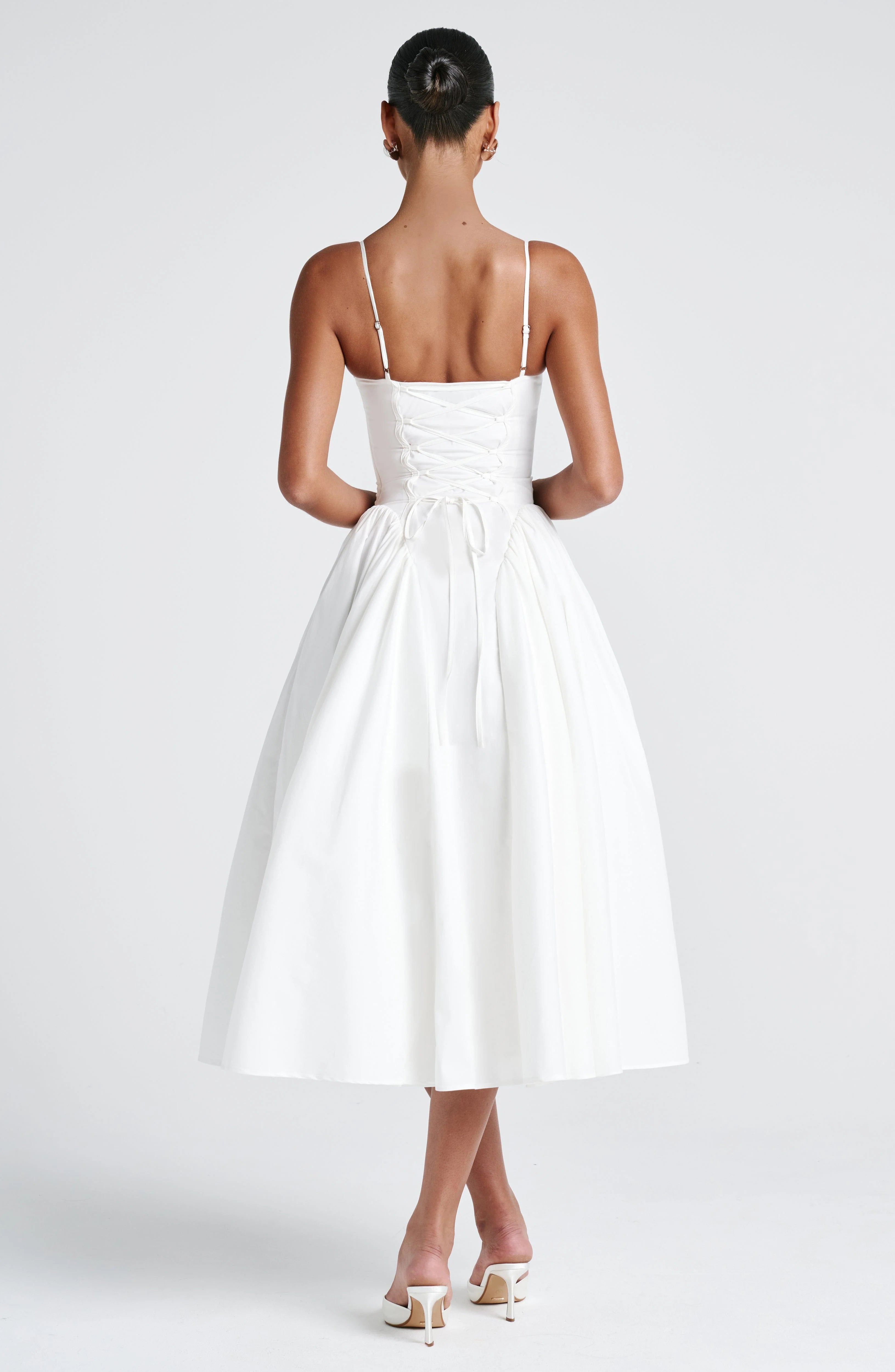 The Emerson Midi Dress in Ivory is a graceful and sophisticated piece that blends romantic details with modern design. Featuring a flattering sweetheart neckline, this dress is designed with a lace-up back for a snatched fit, ensuring it hugs your curves perfectly. The dropped waist enhances its timeless, feminine silhouette, while the gathered godet panels on the sides and hips create a beautiful flow and shape.