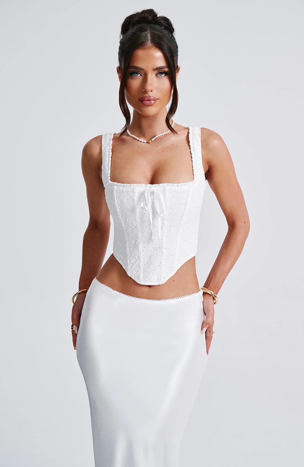 The ultimate wear-forever piece, Emory looks just as good with a mini skirt as it does with your favourite denim. We love the square neckline which frames and lifts the bust, plus the cute frill detail. The corset features our incredible boning for a super cinched fit, made from our pretty broderie anglaise fabric. Complete with a lace up back for your perfect fit, wear yours with minimal jewellery and a soft, messy bun.