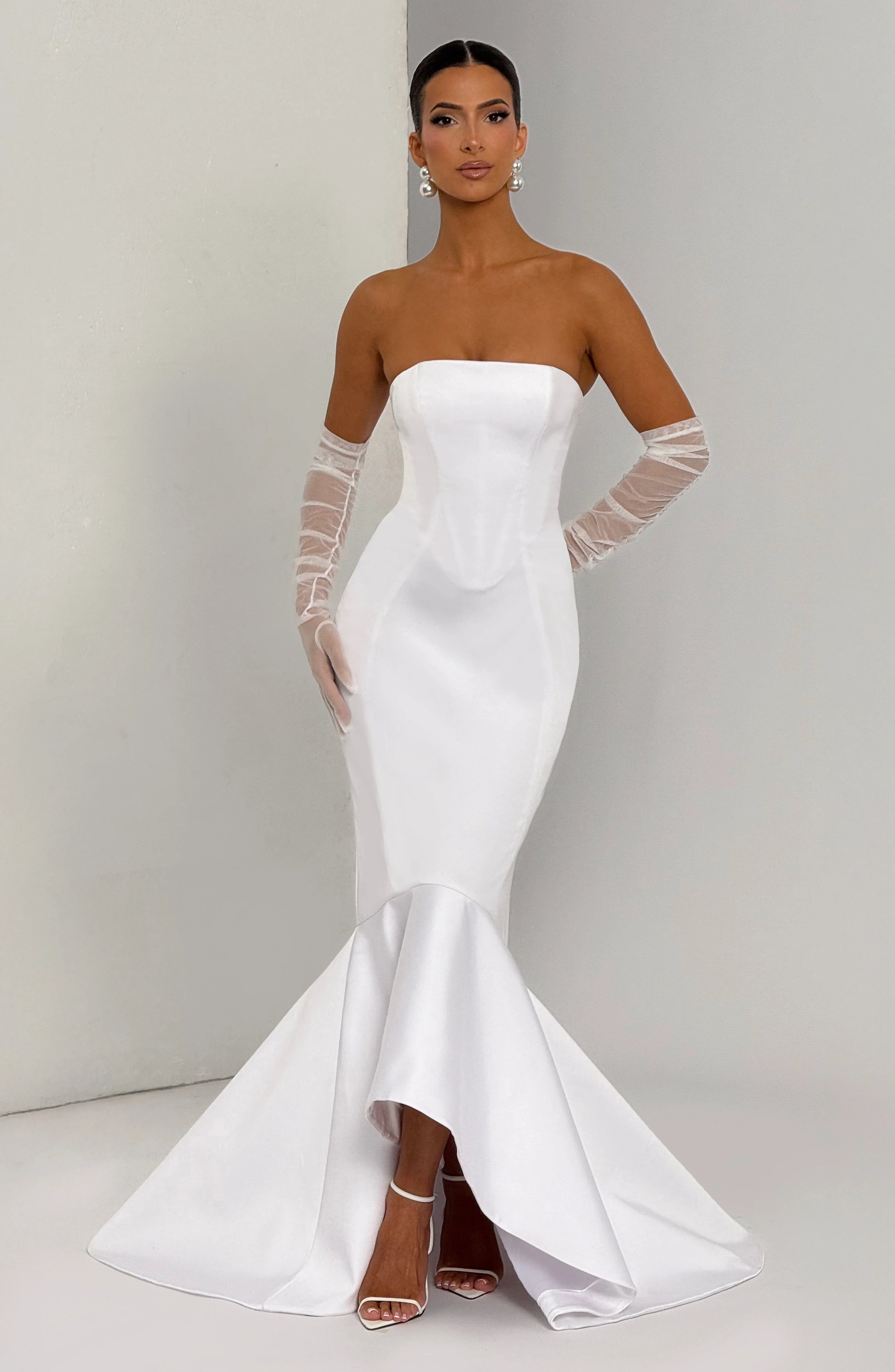 Elevate your evening attire with the Emryn Gown in pristine ivory. Crafted from structured non-stretch twill satin, this sophisticated design features a flattering strapless neckline and thoughtfully placed contour seams that accentuate your silhouette. The elegant mermaid skirt creates a timeless, refined look.