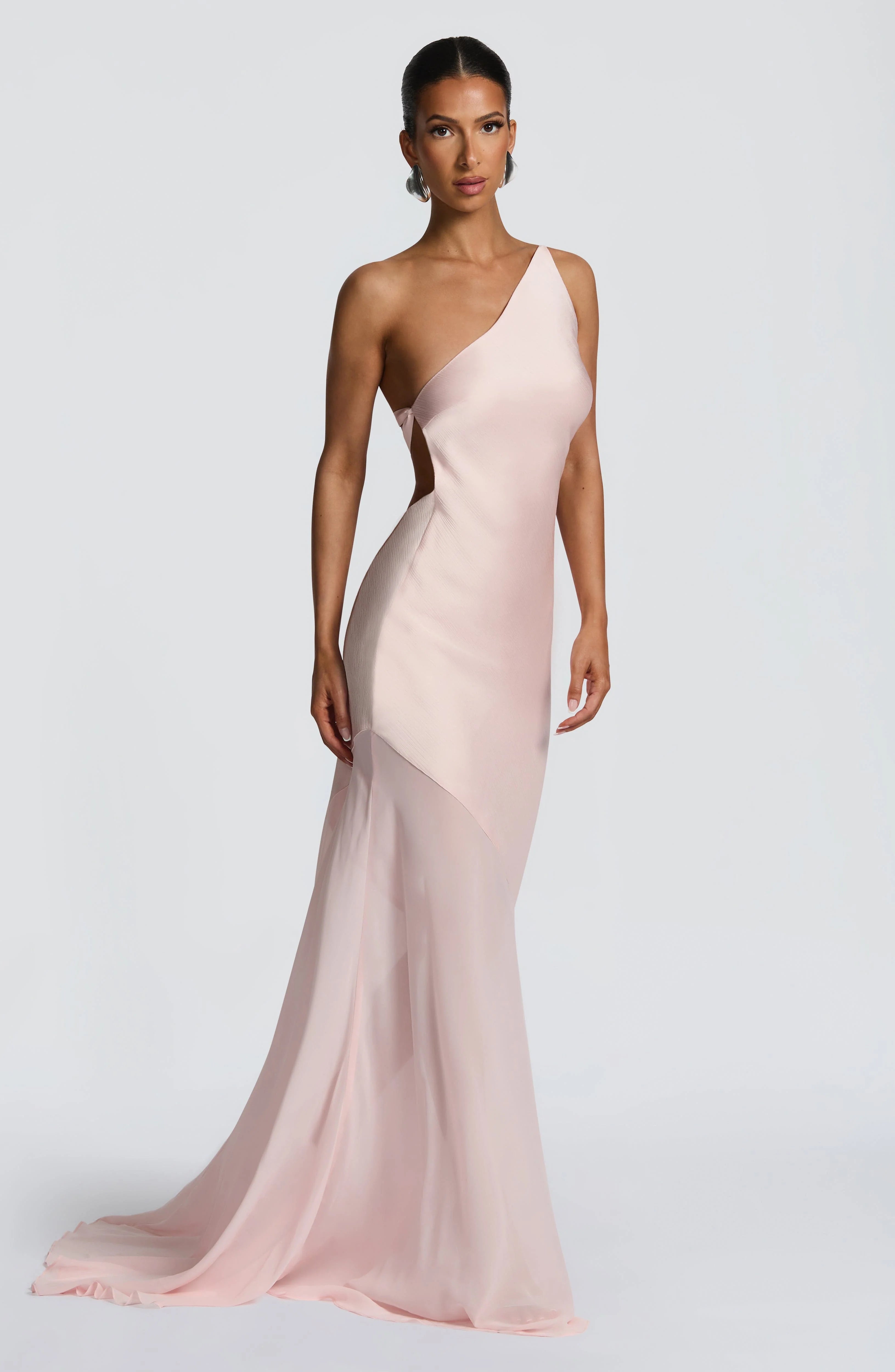 The Fable Gown in blush features a textured satin bodice with a semi-sheer chiffon skirt in a graceful bias cut. Its asymmetric one-shoulder neckline and open back, accented by a cross back strap tied at the hip, enhance its elegant silhouette. The fishtail skirt flares into a delicate train, perfect for refined occasions.