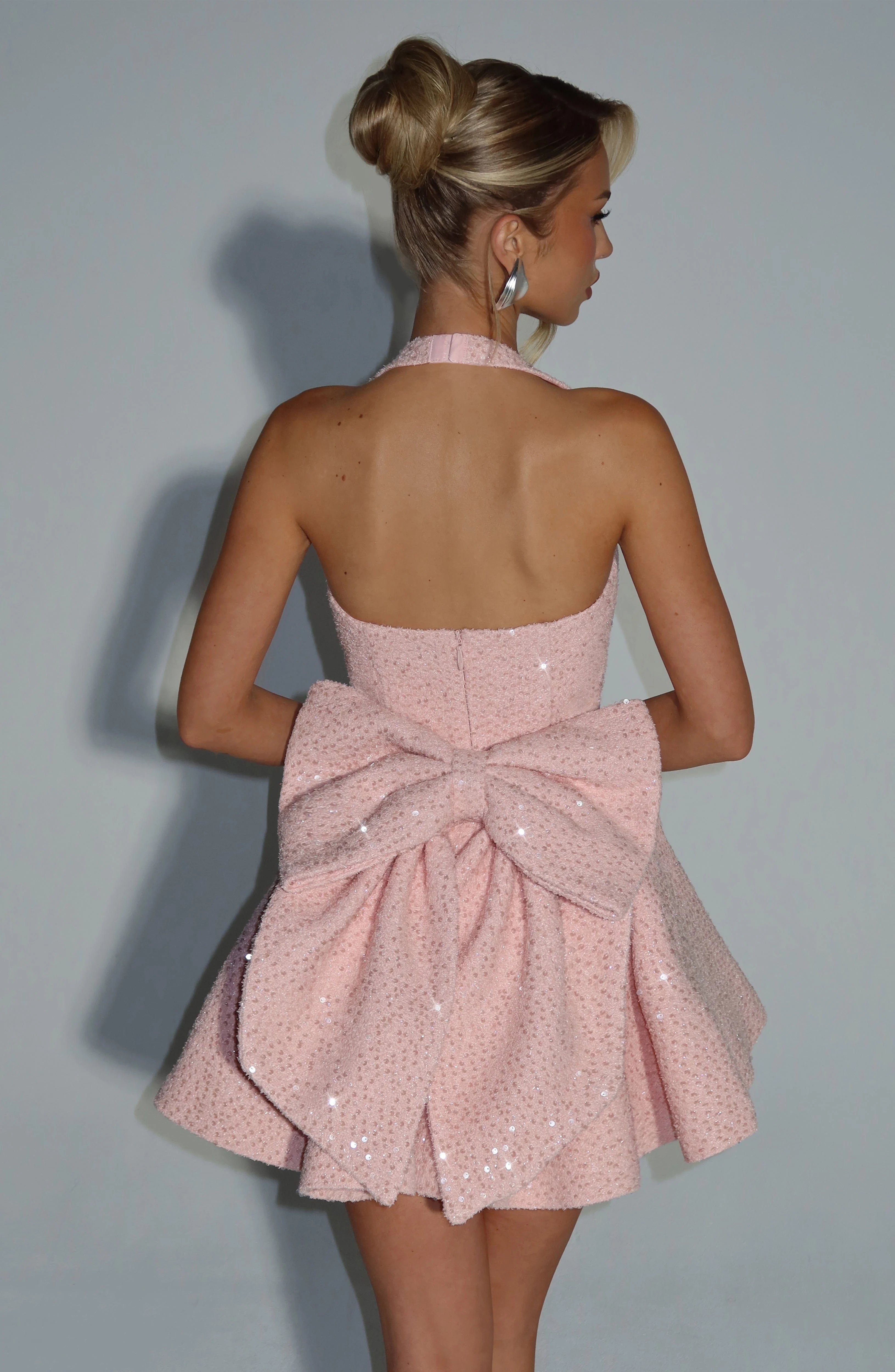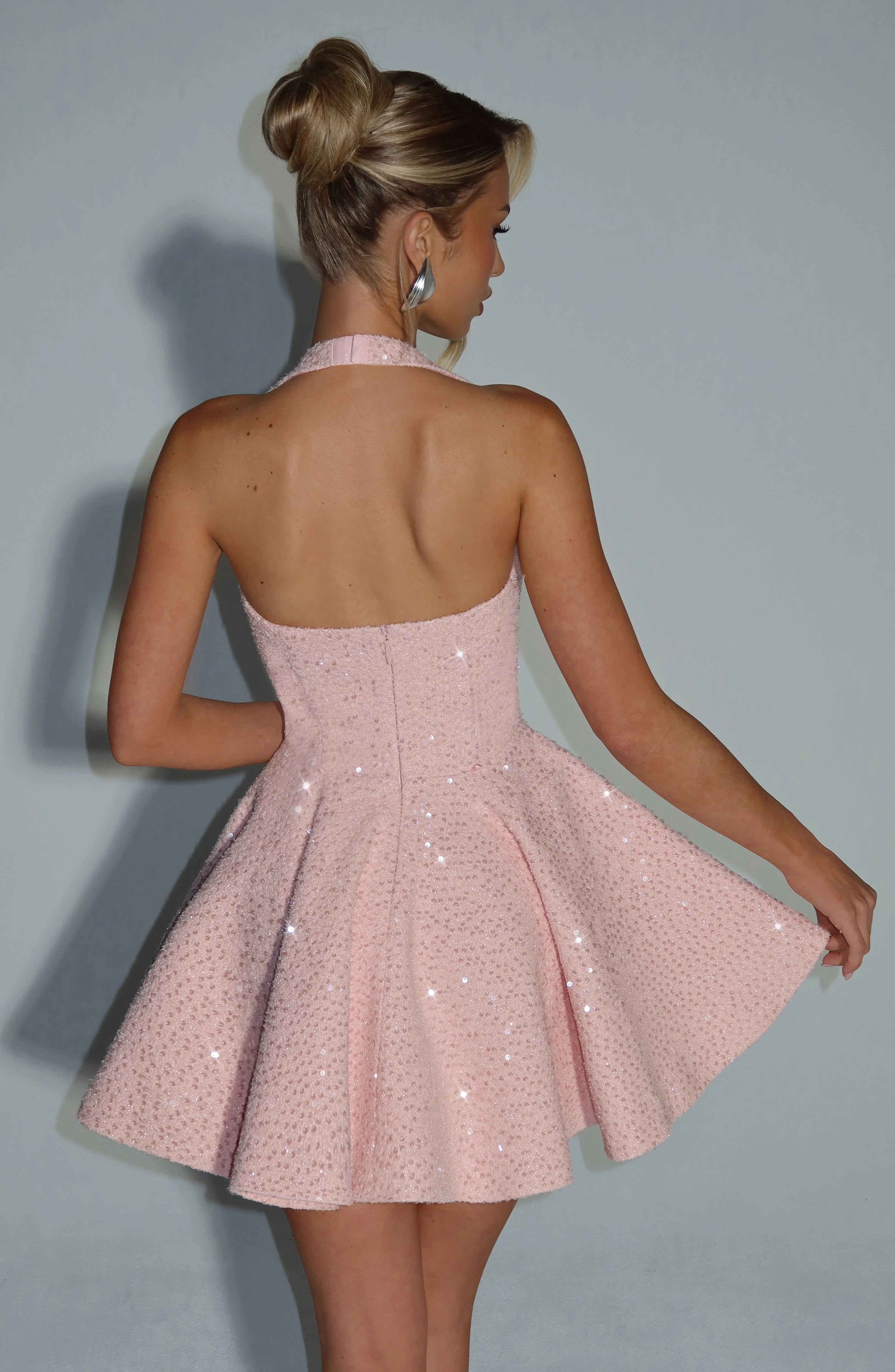 Elevate your style with the Georgette Mini Dress in blush. Crafted from sequin tweed, it features underwired cups and halterneck straps for a flattering fit. The full circle skirt and detachable back bow add elegant movement and versatility to this sophisticated piece.