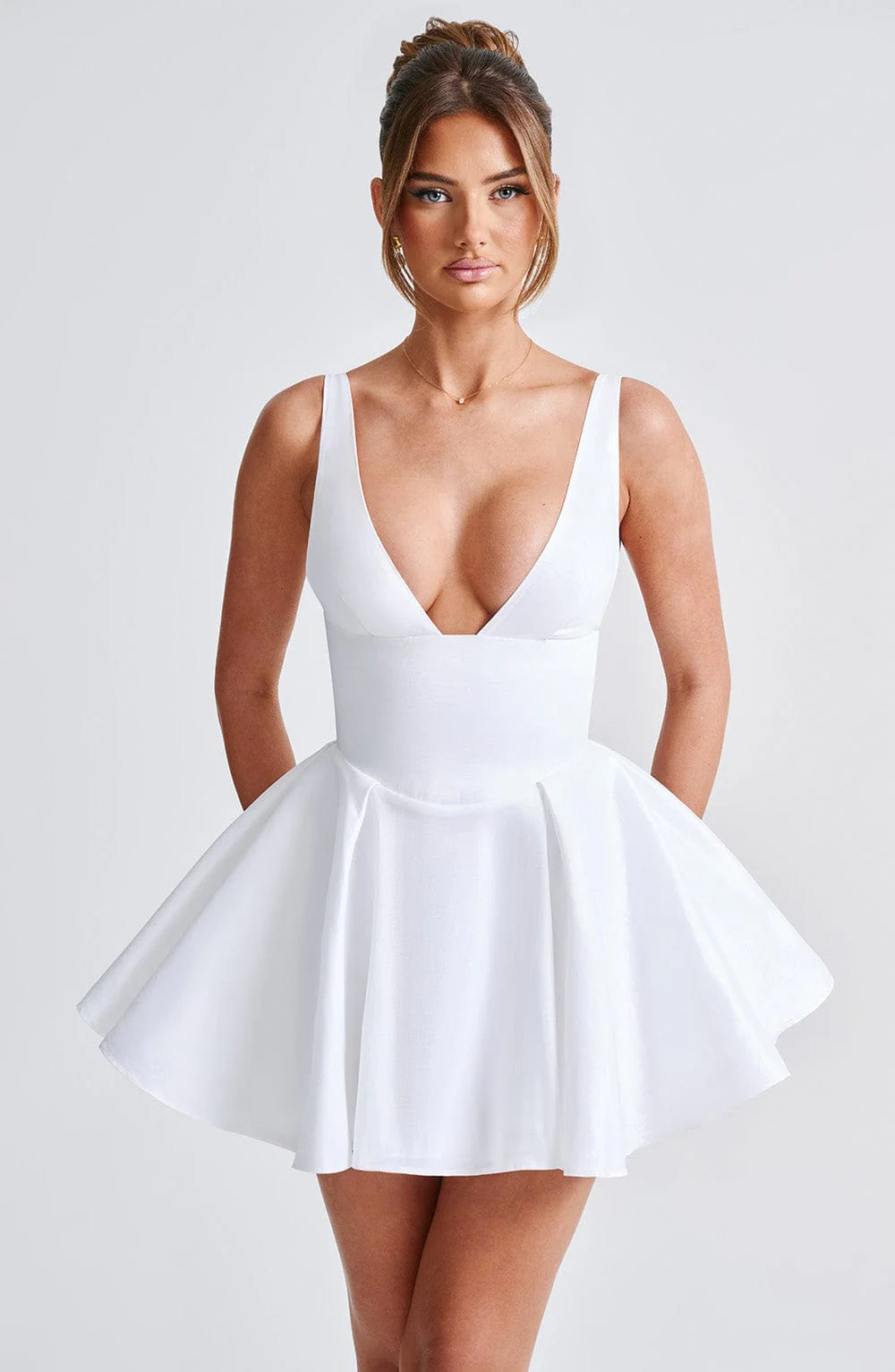 This fun, flirty mini was made for your bachelorette, boo! Featuring a full skirt, this waist-cinching design has high apex cups, adjustable straps and is crafted from the most beautiful taffeta with a slight pearlescent sheen. Wear with platforms and a soft hair up for all the bridal shower vibes.