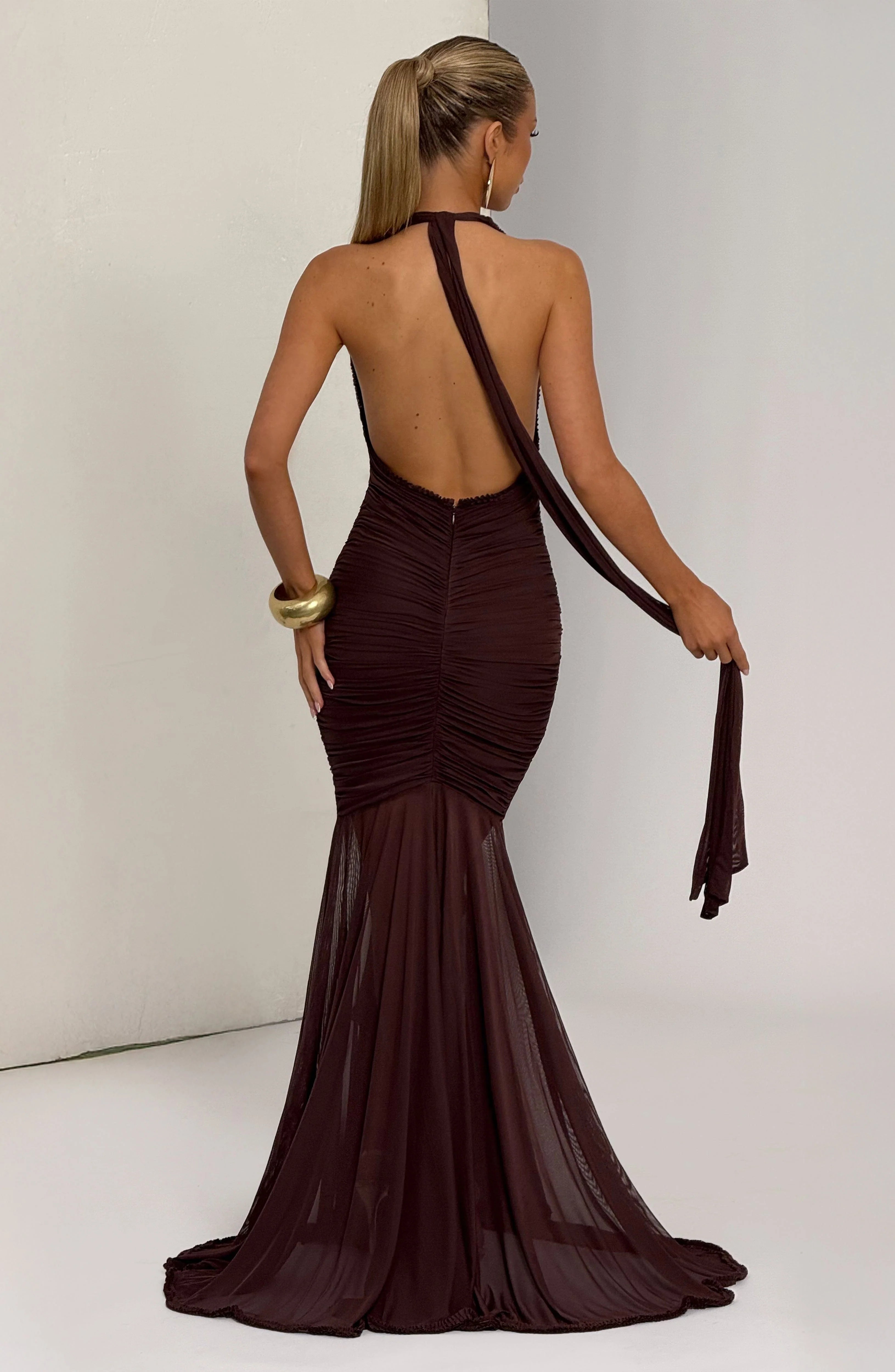 The Janessa Maxi Dress in plum brown features a soft stretch mesh fabric with a deep plunge neckline and halter straps. Its elegant waterfall split and delicate ruffle edges enhance its sophisticated silhouette, while ruching across the hips and a semi-sheer skirt add subtle allure.