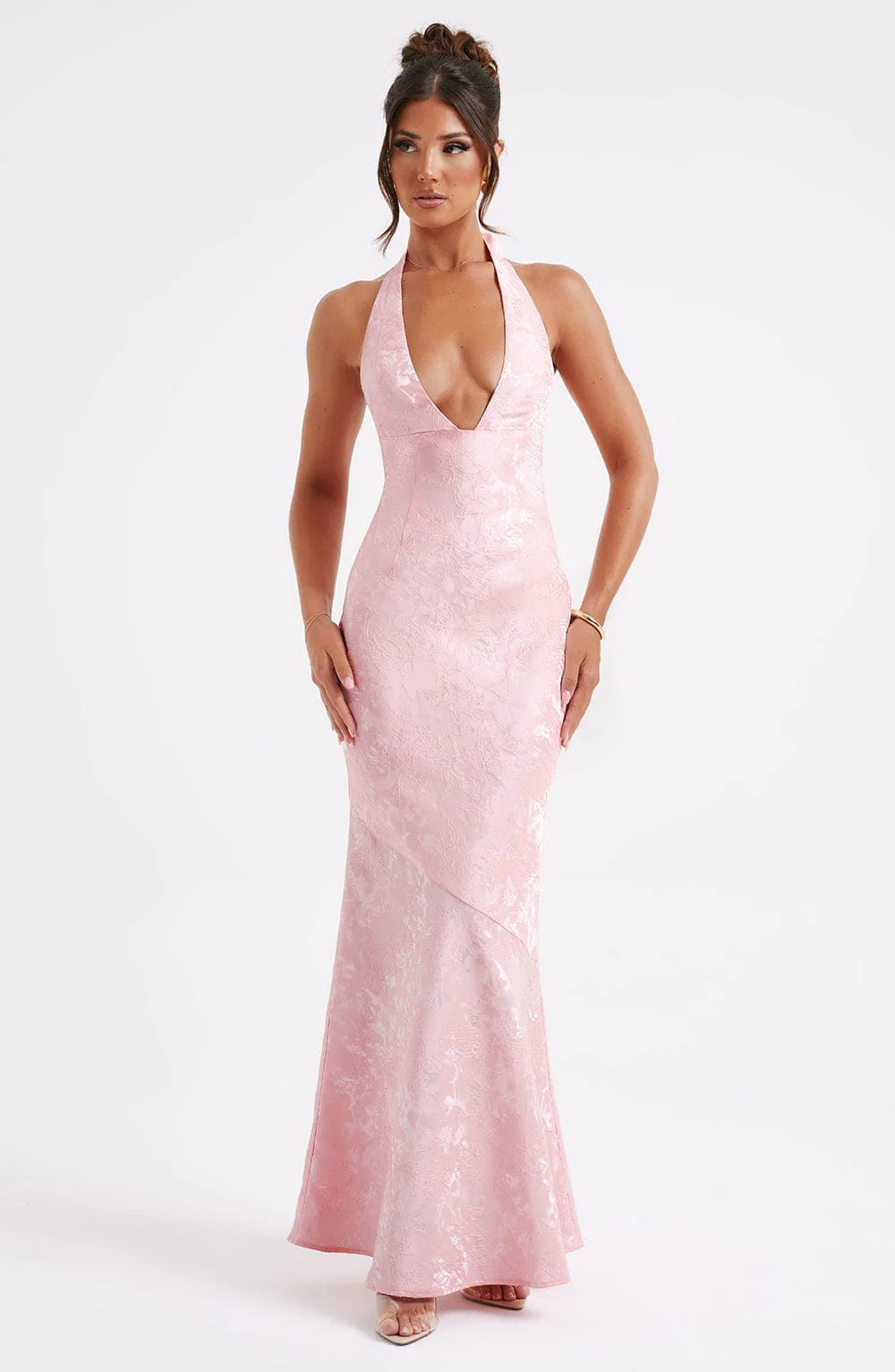 A romantic choice for your special occasions, the Josephine dress is adored by everyone, made in a beautiful floral jacquard fabric. This halterneck style features a plunge neck, waist-cinching fit and falls elegantly to a floor sweeping maxi length.