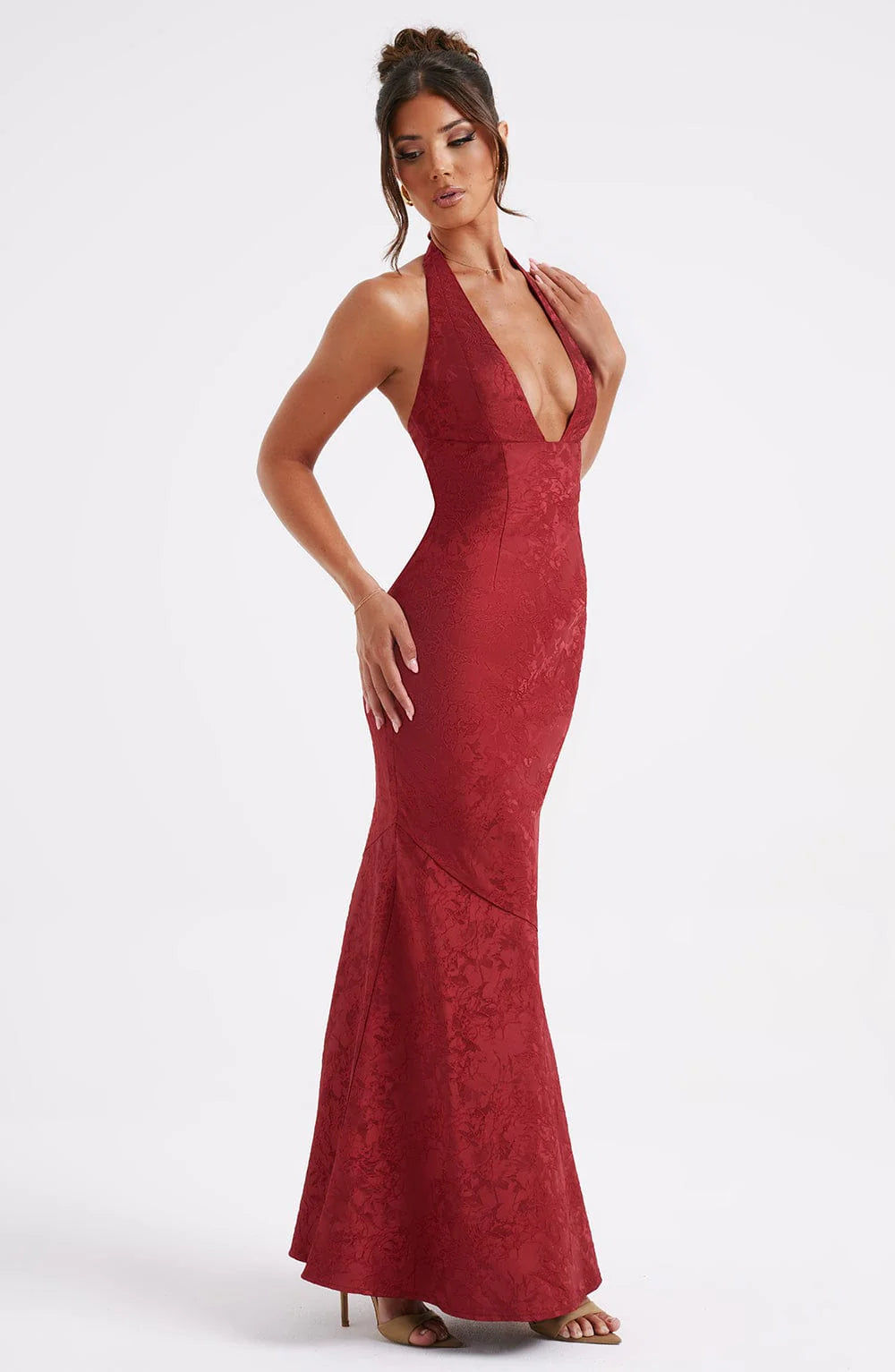 A romantic choice for your special occasions, the Josephine dress is adored by everyone, made in a beautiful floral jacquard fabric. This halterneck style features a plunge neck, waist-cinching fit and falls elegantly to a floor sweeping maxi length.