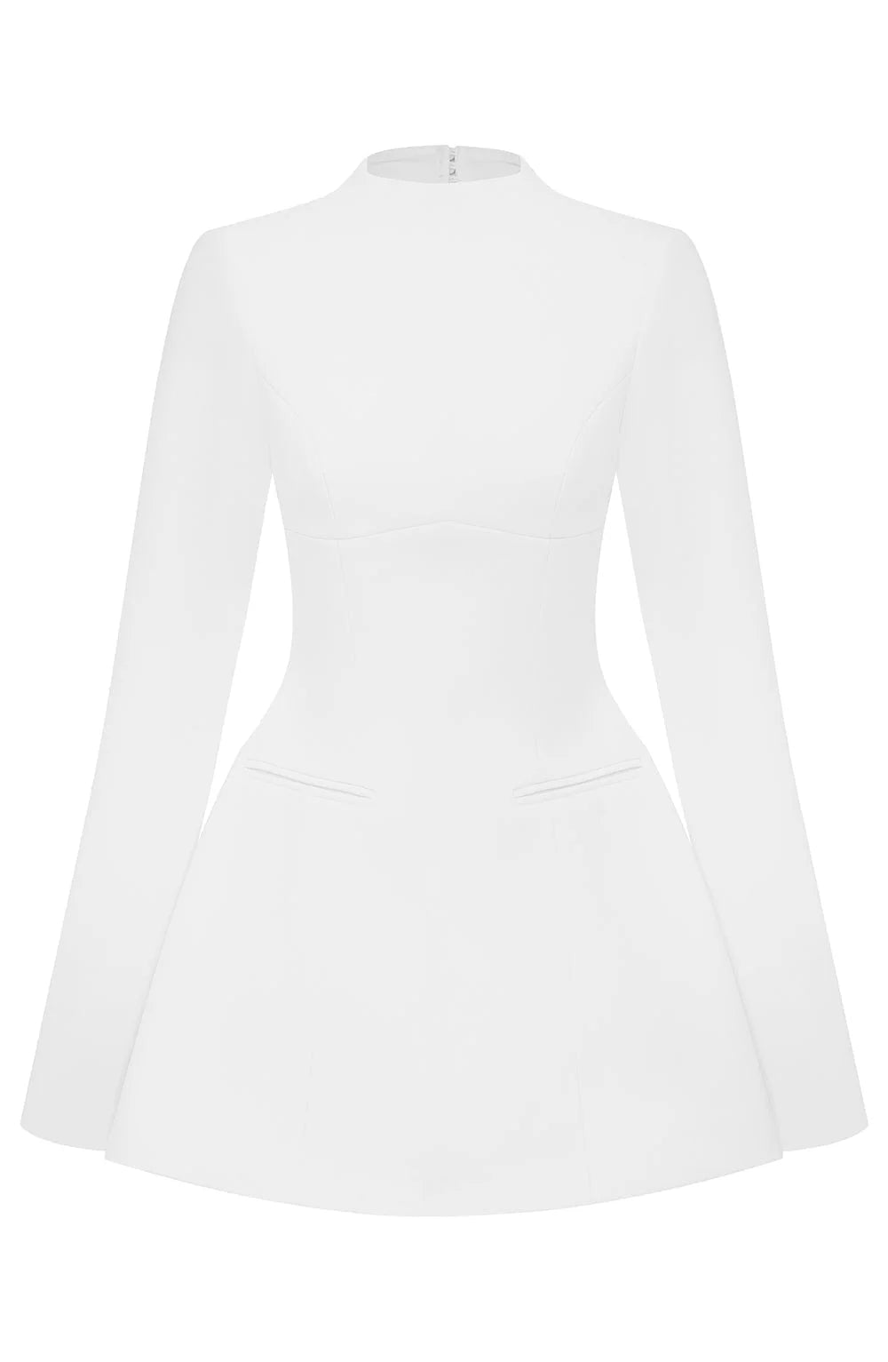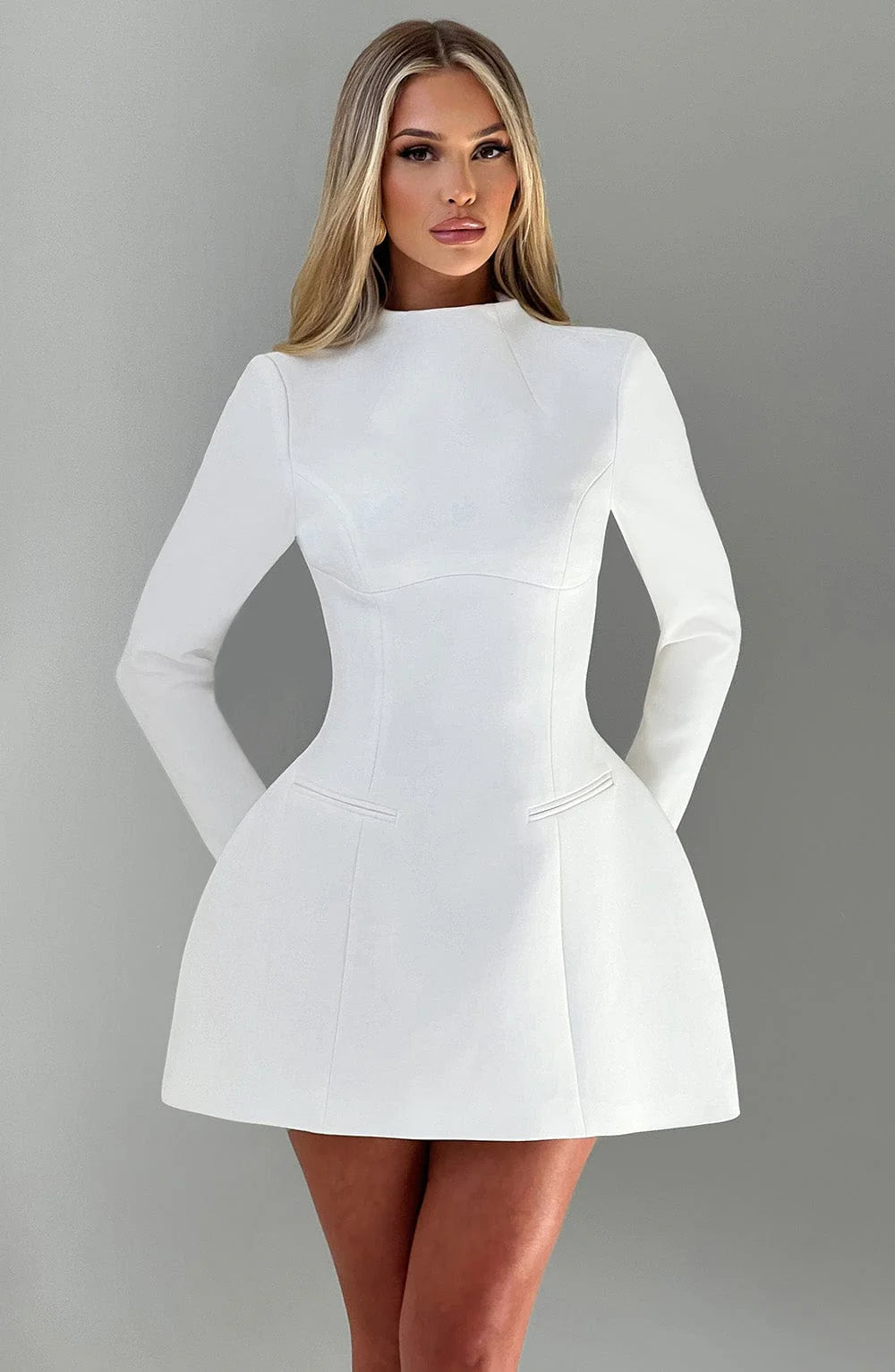Kelly is here to dress you for the new season and big dreams. This chic mini is made from premium crepe, with long sleeves and a high darted neckline. It features a keyhole cut out to the back and is complete with welt pockets and bubble shaped skirt. Style with pointed heels and a tonal mini bag.