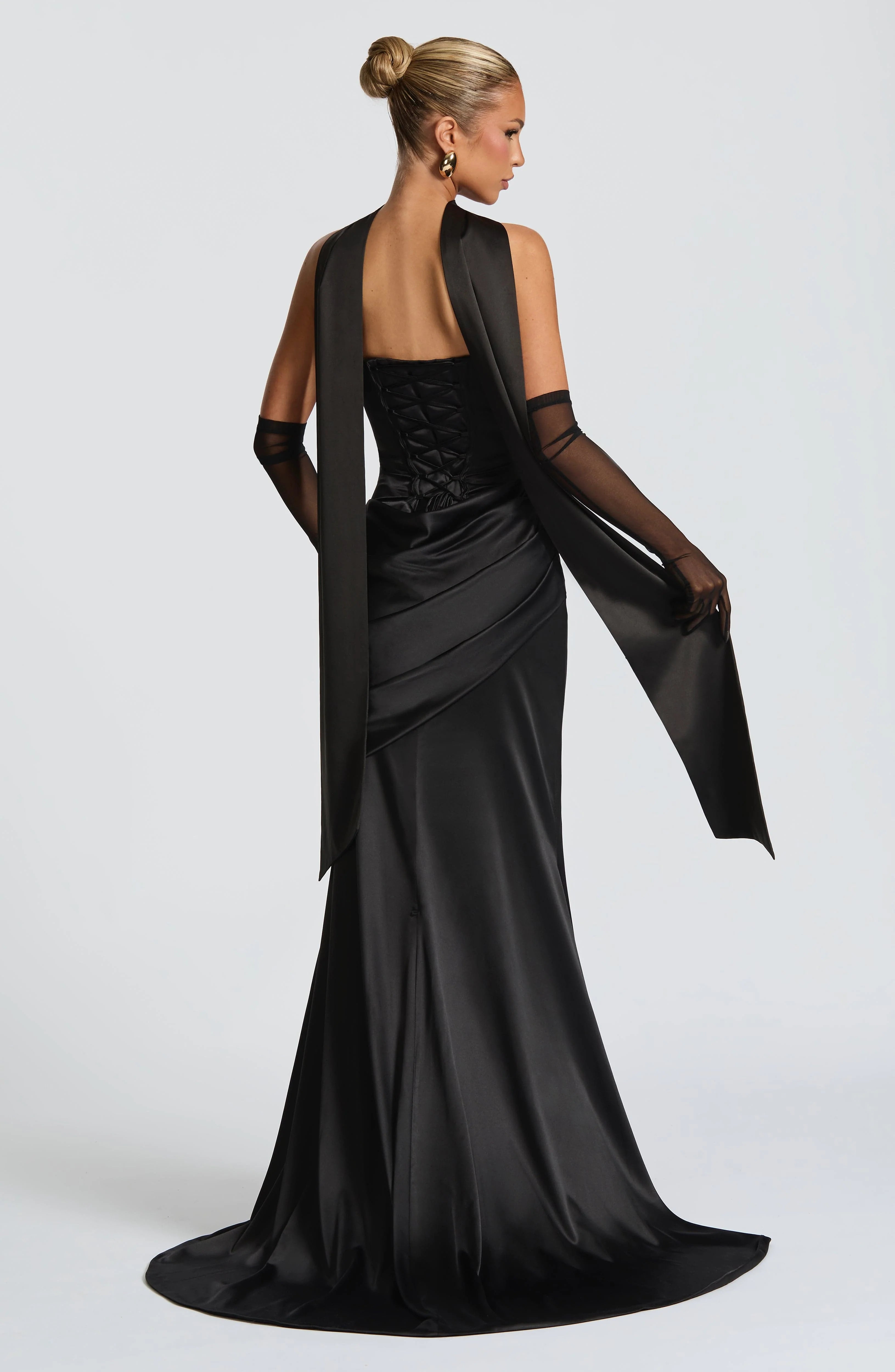 The Kensington Maxi Dress in black is a luxurious, sophisticated choice for any formal occasion. The stretch satin fabric drapes elegantly on the fit & flare skirt with a train, while the strapless neckline and boned bodice create a structured and flattering silhouette. The pleated cowl and lace up back add a touch of intricate detail.