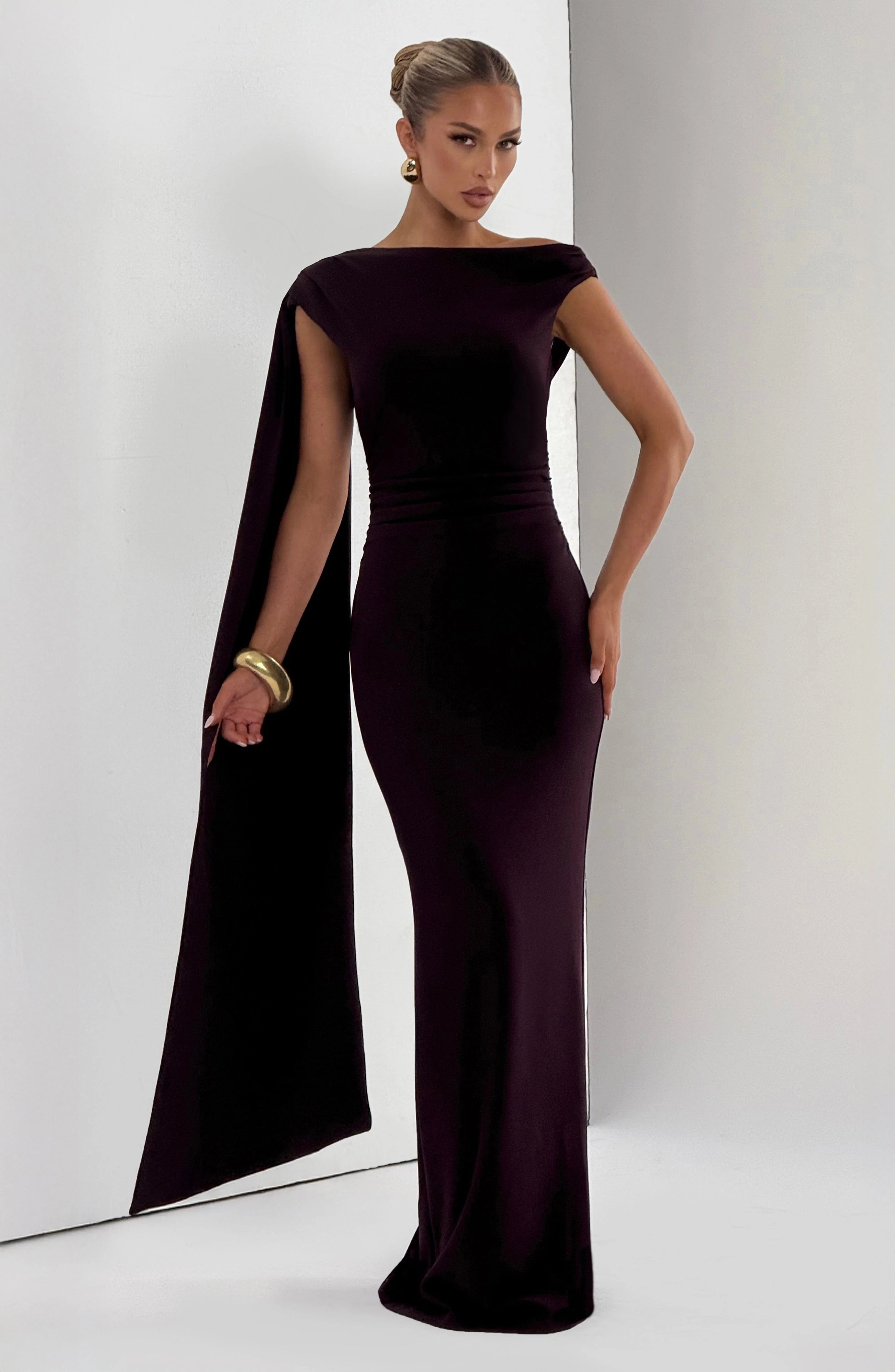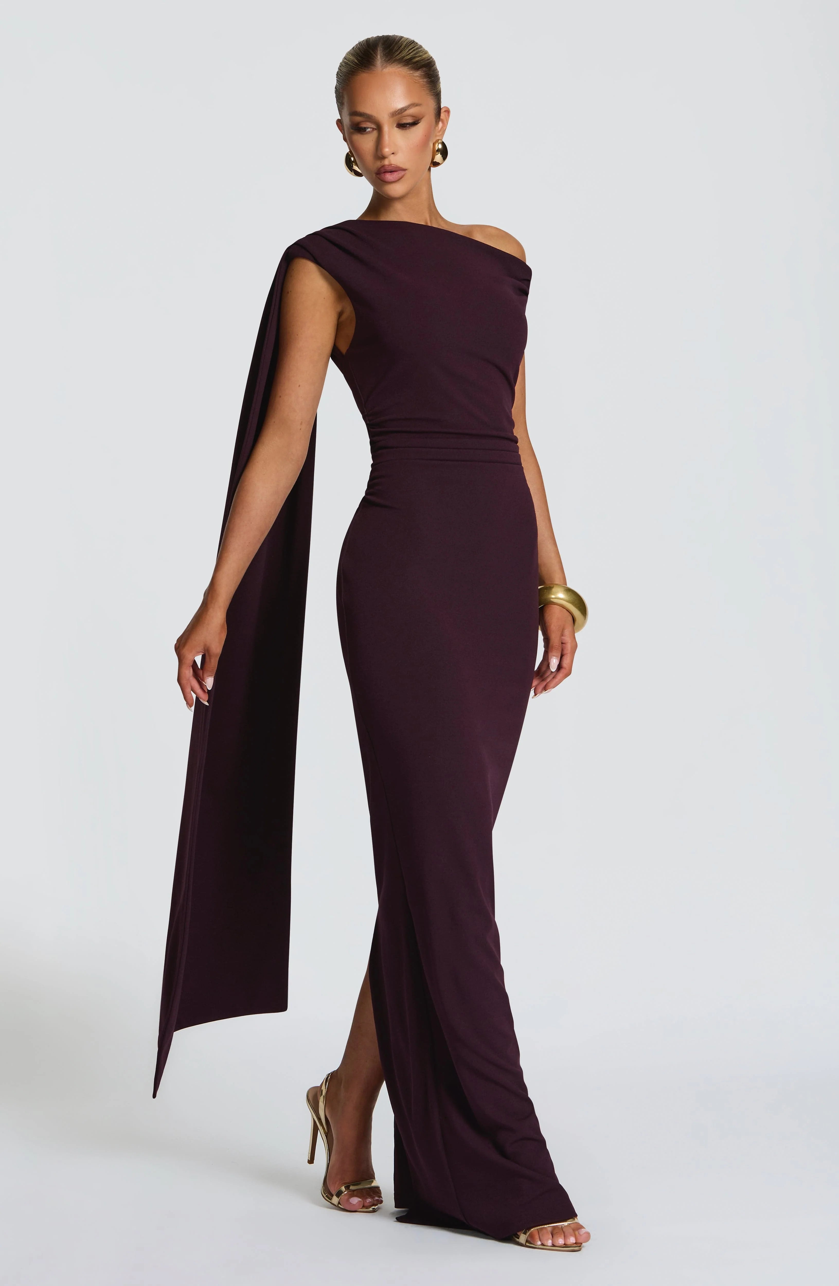 The Kylie Maxi Dress in plum features stretch crepe fabric for a flattering fit. Its sophisticated design includes asymmetric pleating on the shoulder, gathering at the waist, and a draped panel, enhancing elegance. The high, wide neckline and back shoulder straps complement the column skirt with a centre-back split for graceful movement.