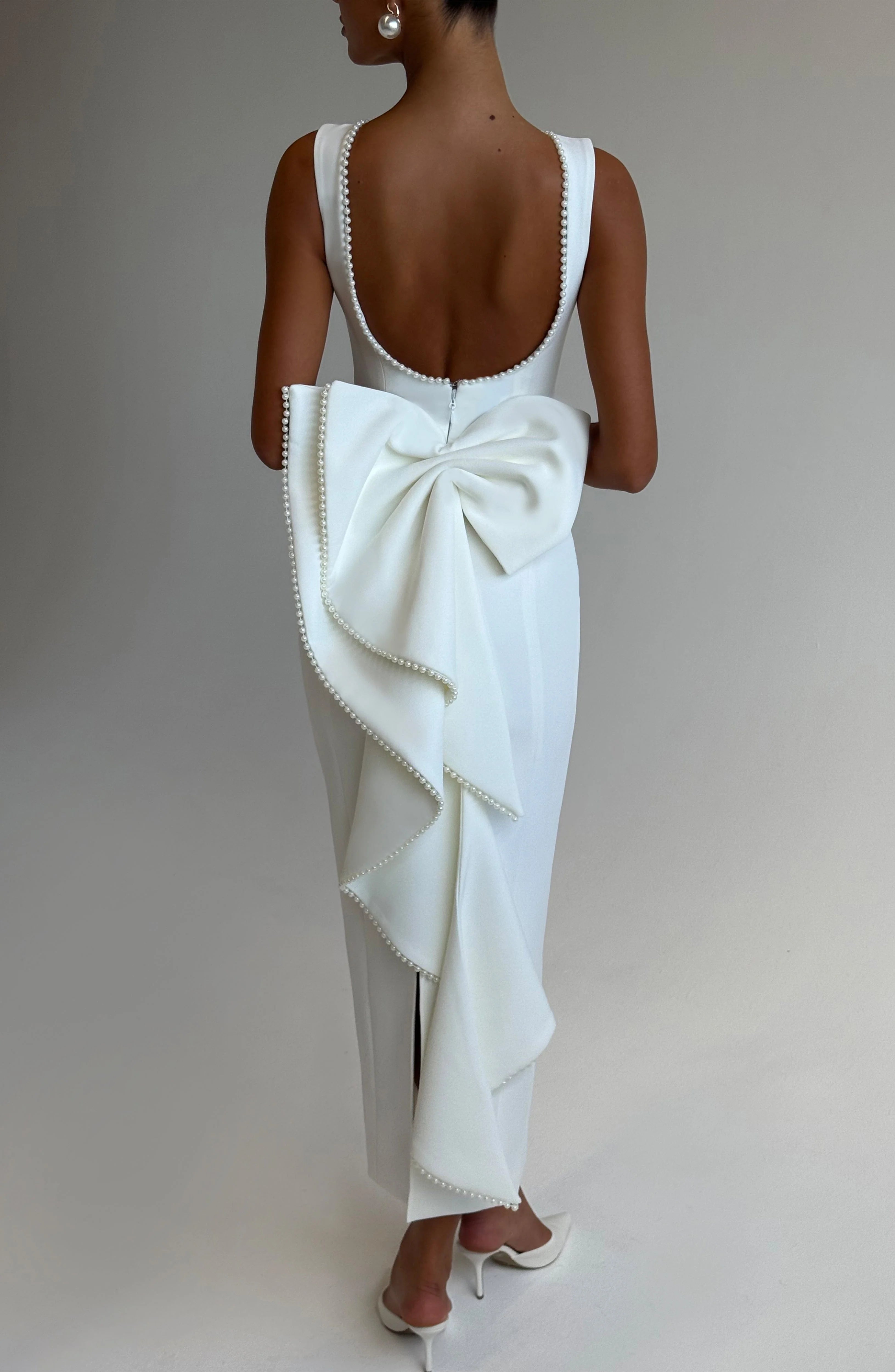 The Lana Midaxi Dress in Ivory is the epitome of timeless elegance. Crafted from luxurious non-stretch crepe, it features a high, wide boat neckline adorned with a delicate pearl trim. The sleek column skirt flows effortlessly, complete with a centre-back split for graceful movement. A statement detachable oversized bow, also trimmed with pearls, drapes beautifully at the back, adding a dramatic yet refined finish.