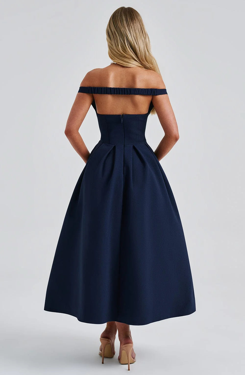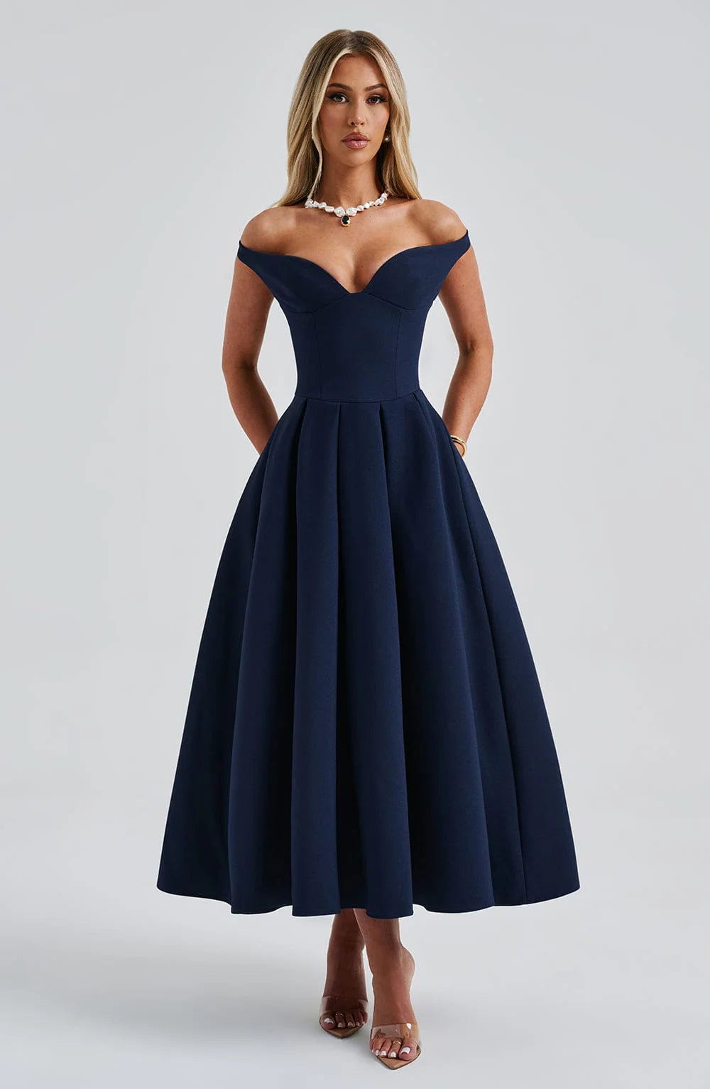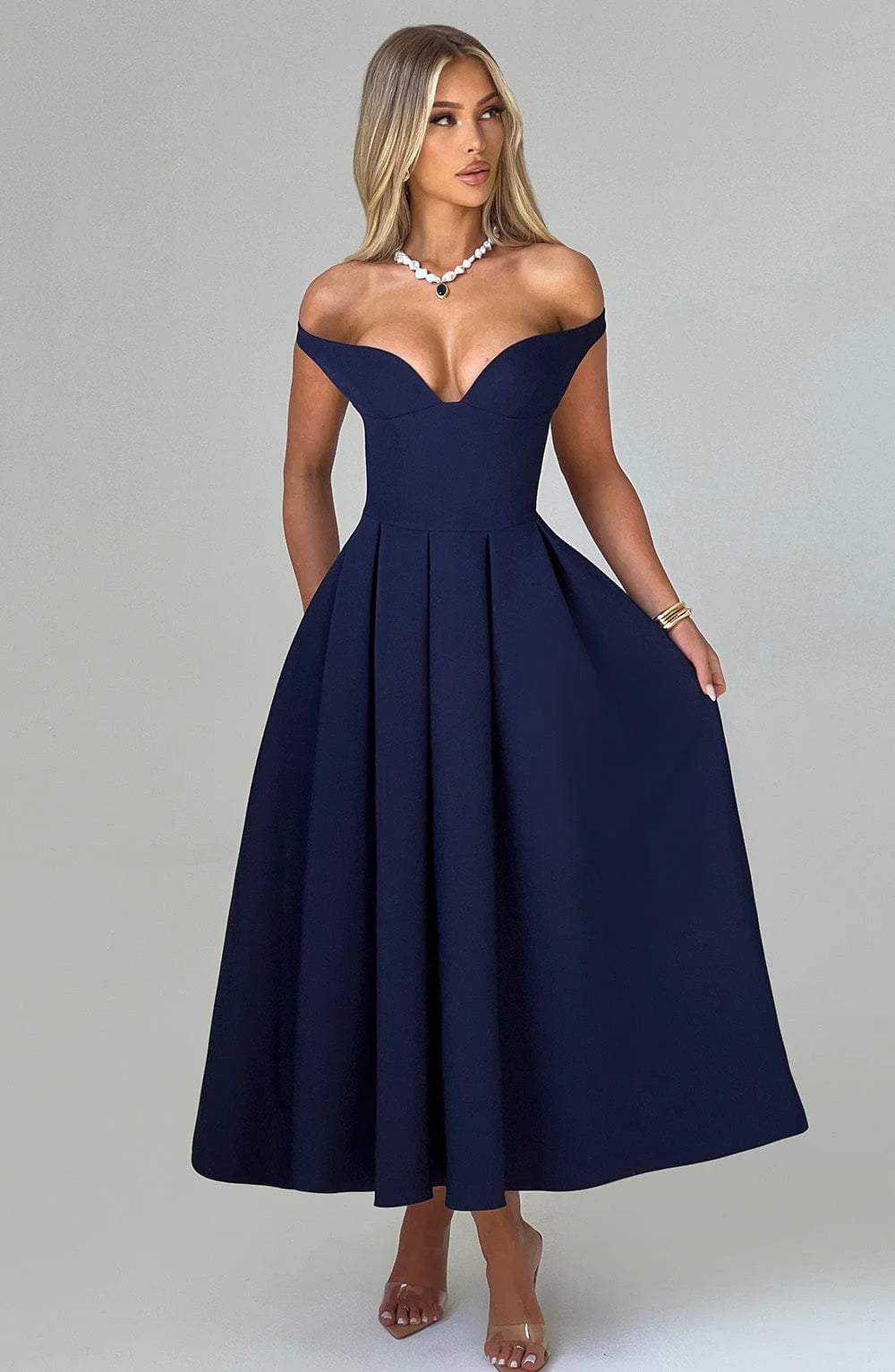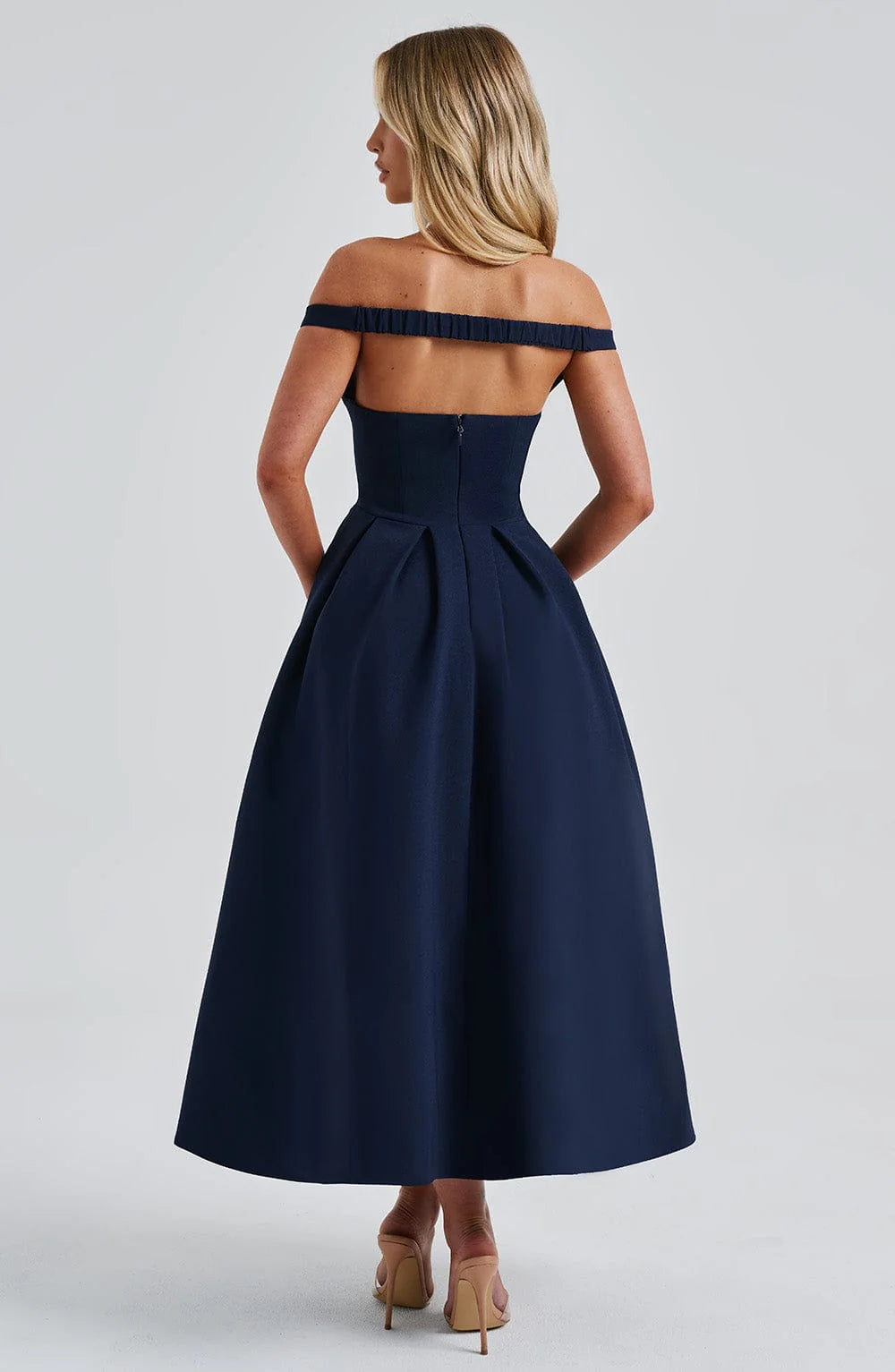 The epitome of elegance, Lanetta features a plunge bardot neckline with elasticated back strap bringing stylish flair. Falling to an effortlessly chic midi length, the design has a full, box pleated skirt and looks amazing paired with pointed heels and soft glam.