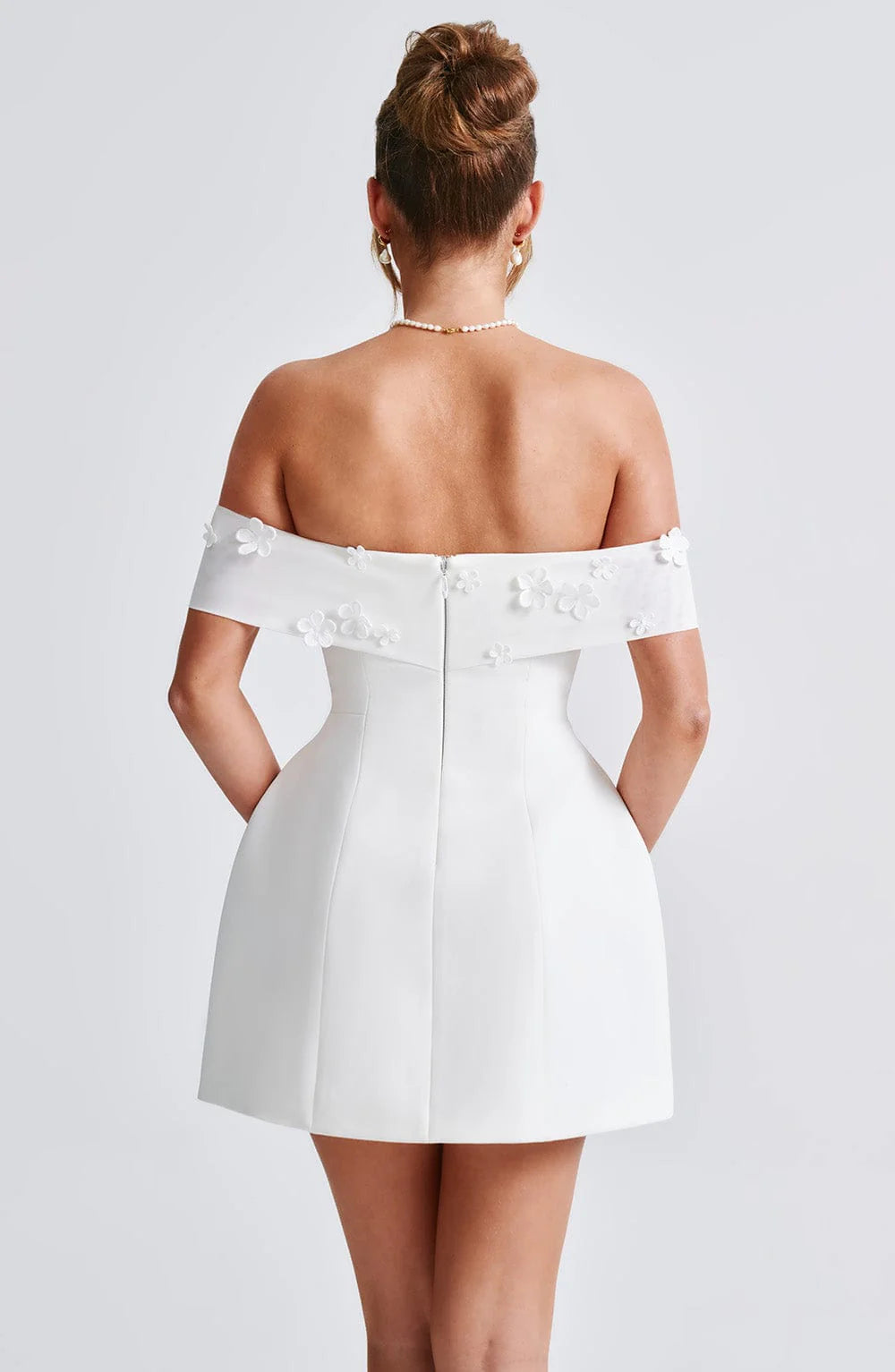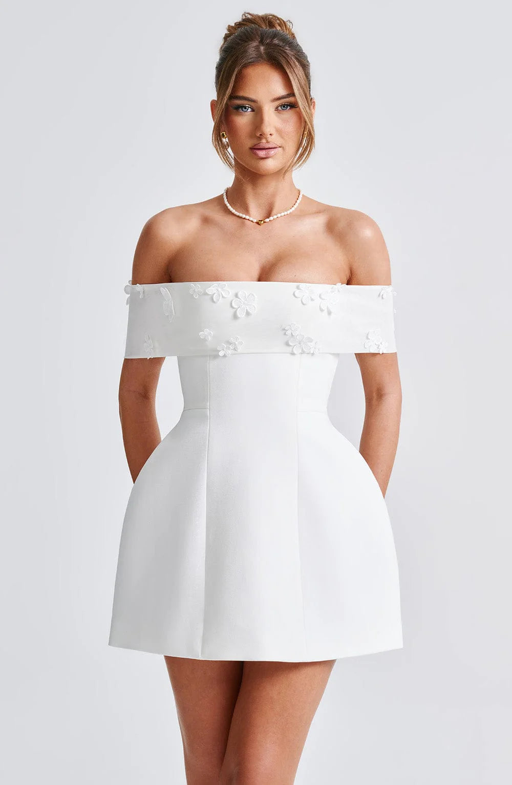 Made for those moments you won't forget, Laurel is the mini of the moment. Cut from our luxe crepe fabric, this dreamy dress has a mesh bardot neckline which is adorned with 3D applique flowers. It has panelled seams throughout the body for a sculpted fit around the waist, which is complemented with a pretty bubble shaped skirt. Dress her up with tonal heels for your bachelorettes and bridal showers.