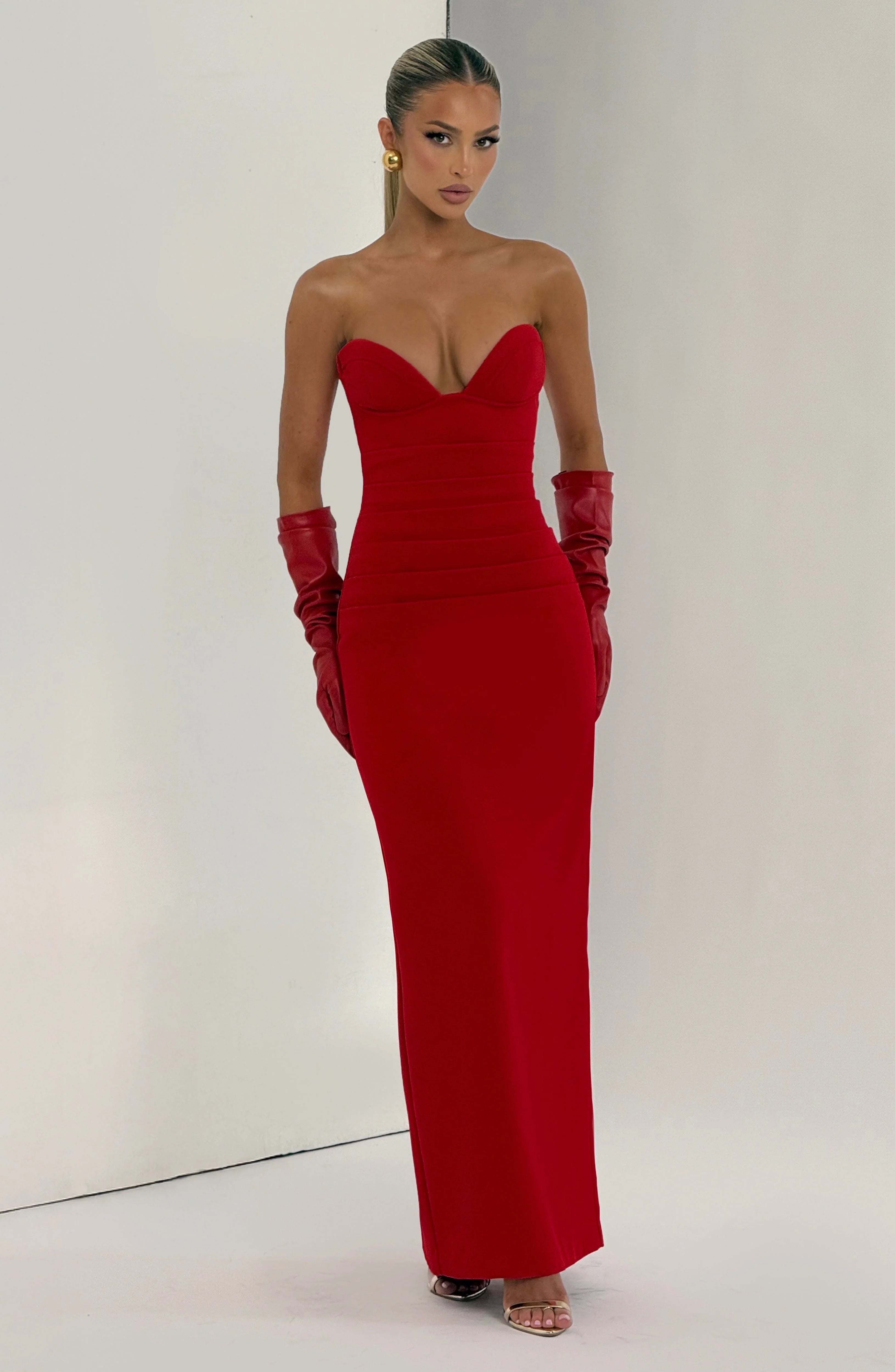 The Lindsey Maxi Dress in red features a strapless, underwired design with lightly padded cups and a cupped neckline for elegant support. Crafted from non-stretch crepe with pleating at the waist, its column-shaped skirt includes a centre back split for graceful movement.