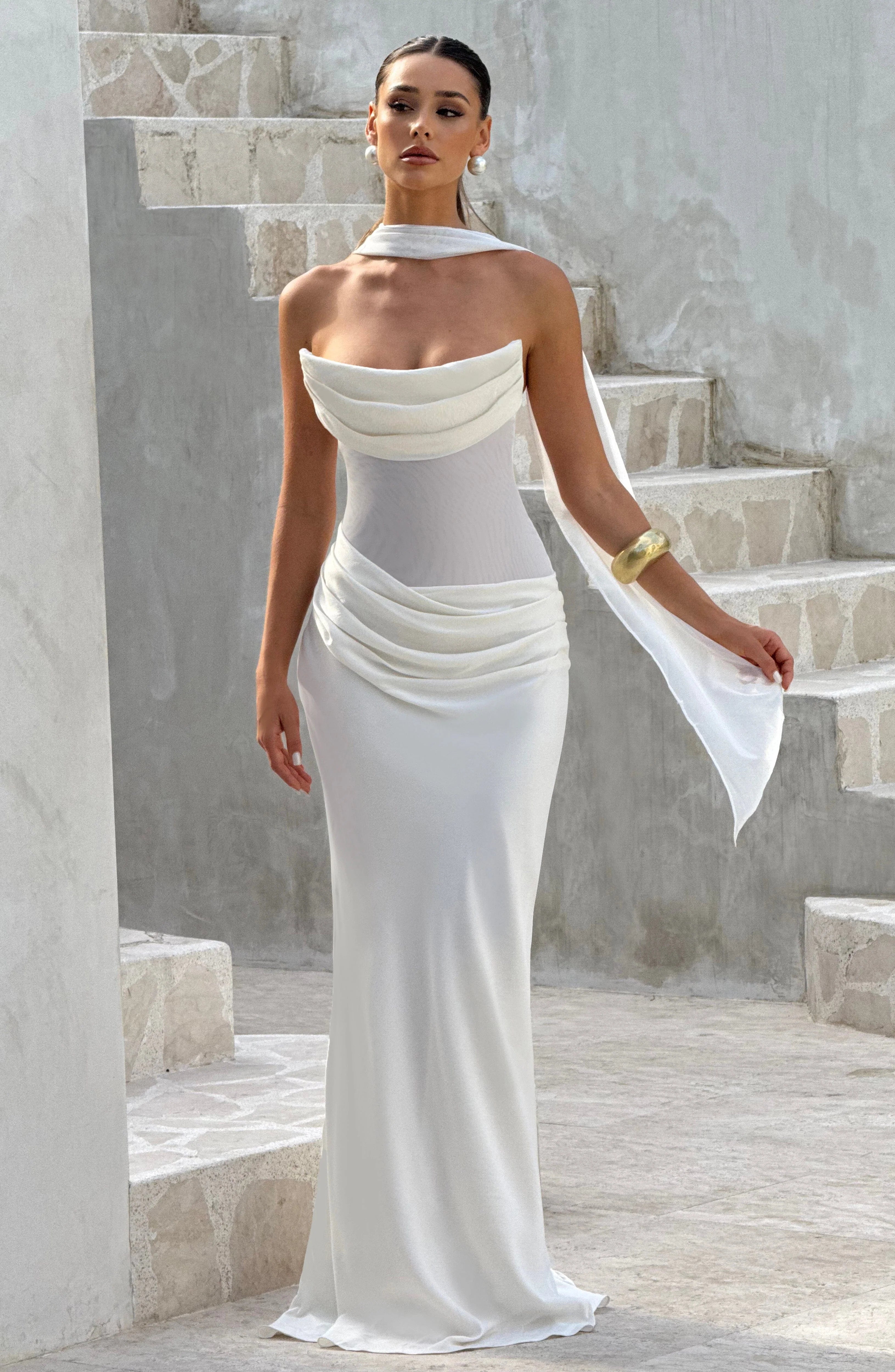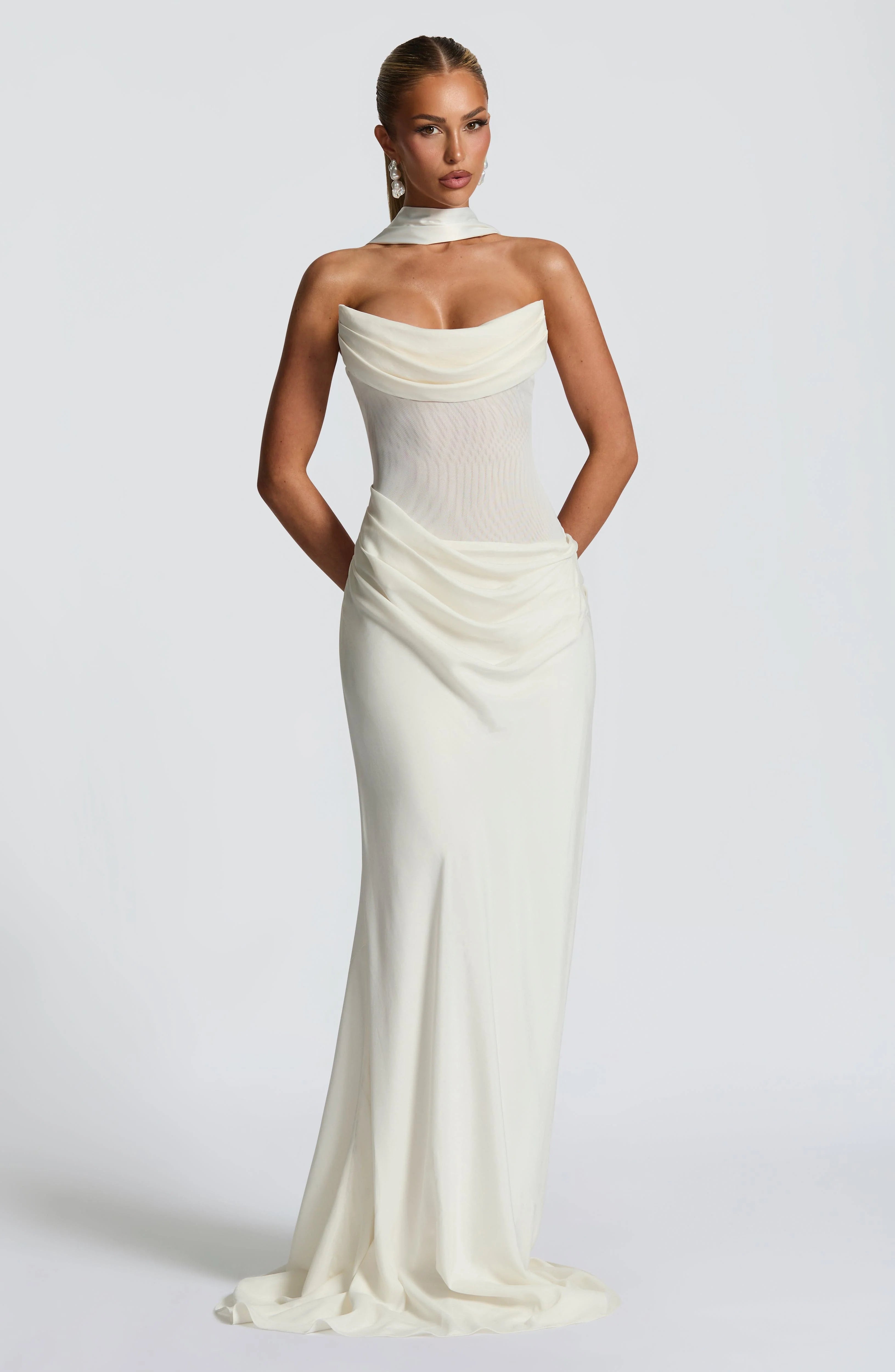 The Liora Maxi Dress in Ivory features a strapless cowl neckline, structured cupro bust, and mesh body. Its fit-and-flare silhouette includes an asymmetric bias-cut skirt, lace-up back with boning, and a lined skirt with an invisible side zipper for a refined finish.