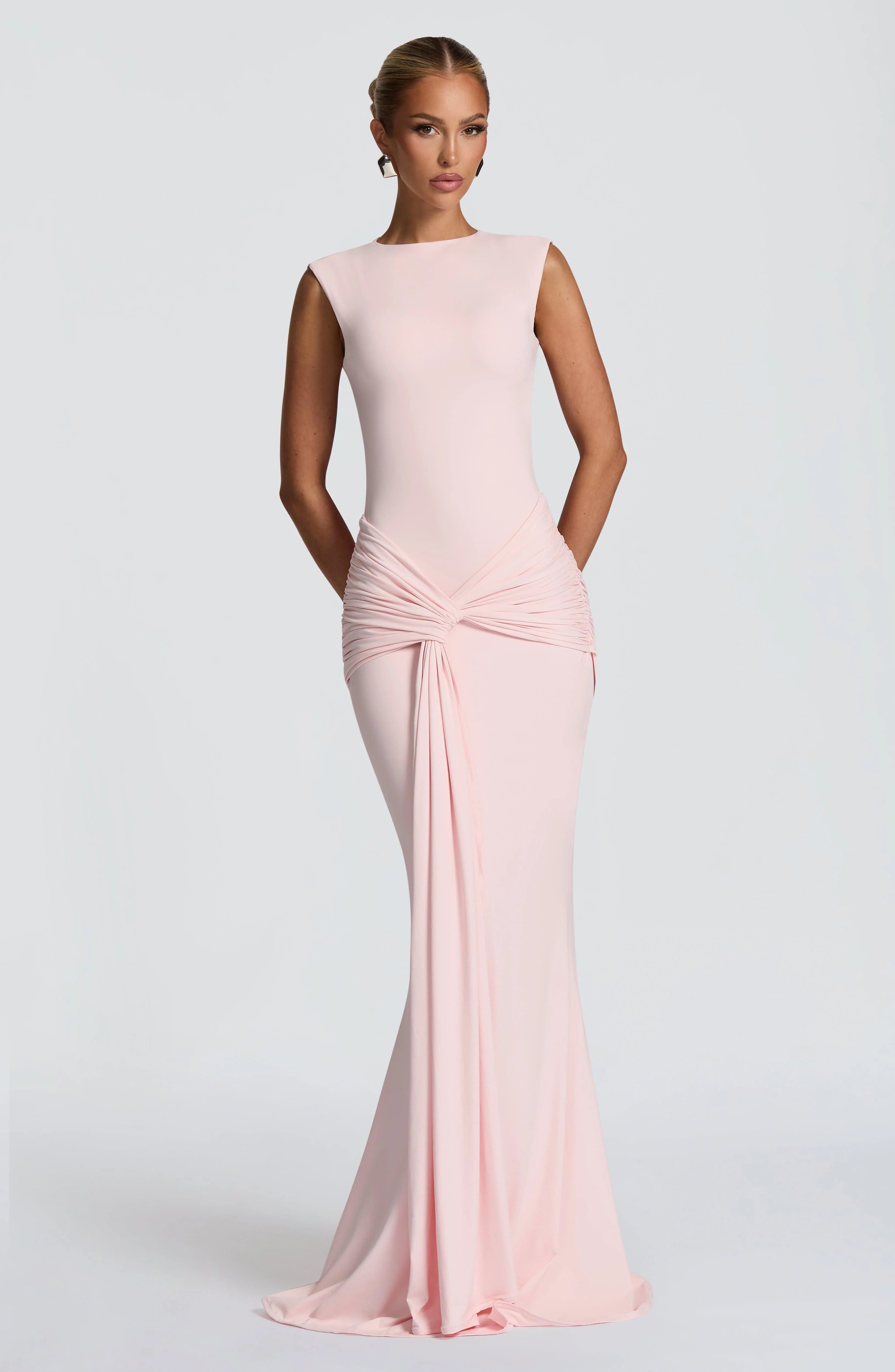 The Lorenza Maxi Dress in blush combines a sleek high neckline with an open keyhole back. Made from slinky jersey, it features a fitted bodice and fit-and-flare skirt, highlighted by a ruched knot detail and drape tie for a refined silhouette.