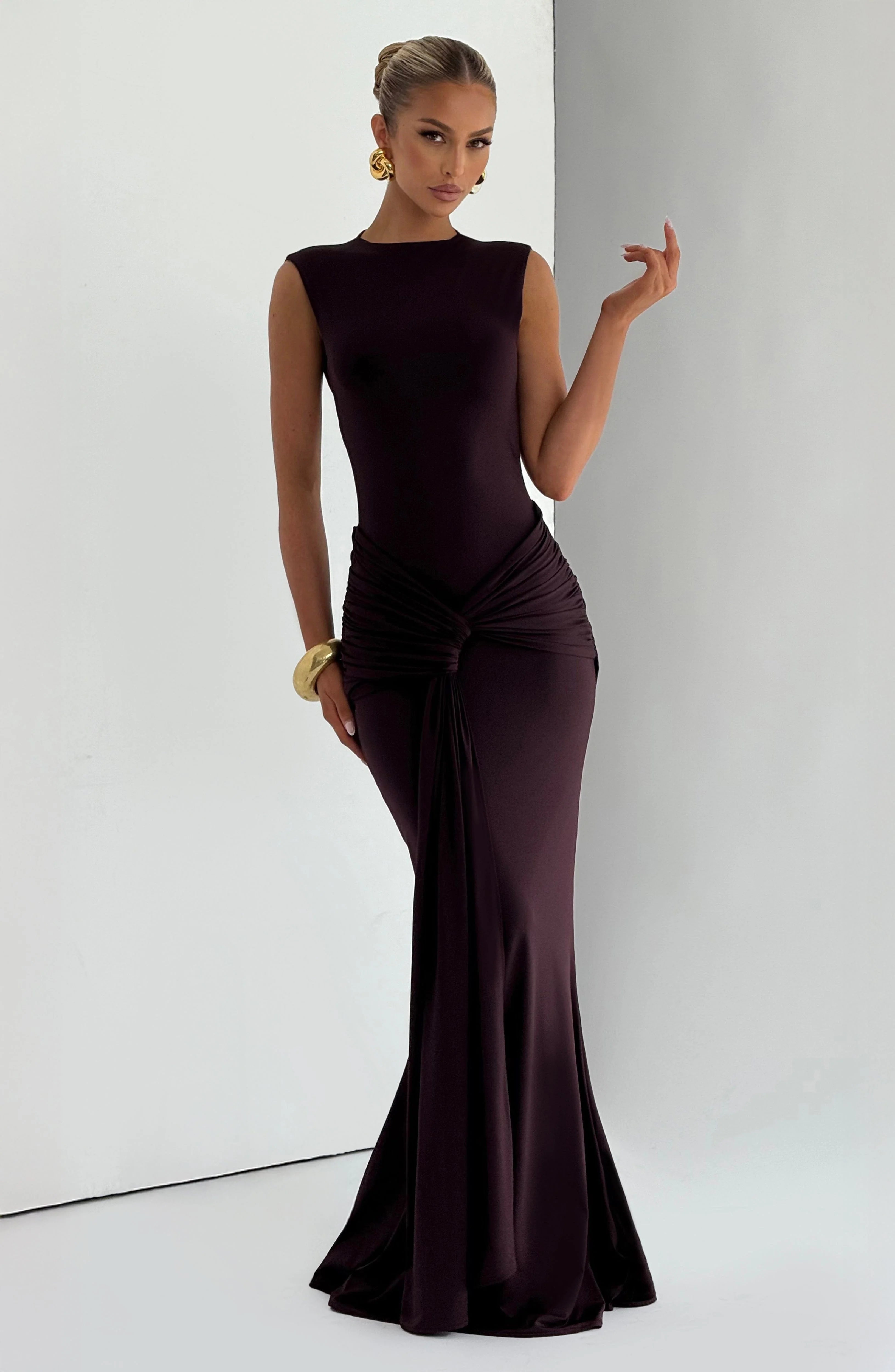 The Lorenza Maxi Dress in rich plum features a high neckline and an open keyhole back for elegant allure. Crafted from slinky jersey, it offers a fitted bodice and a flattering fit-and-flare skirt. A ruched panel with a central knot and long drape tie accentuates the hips.