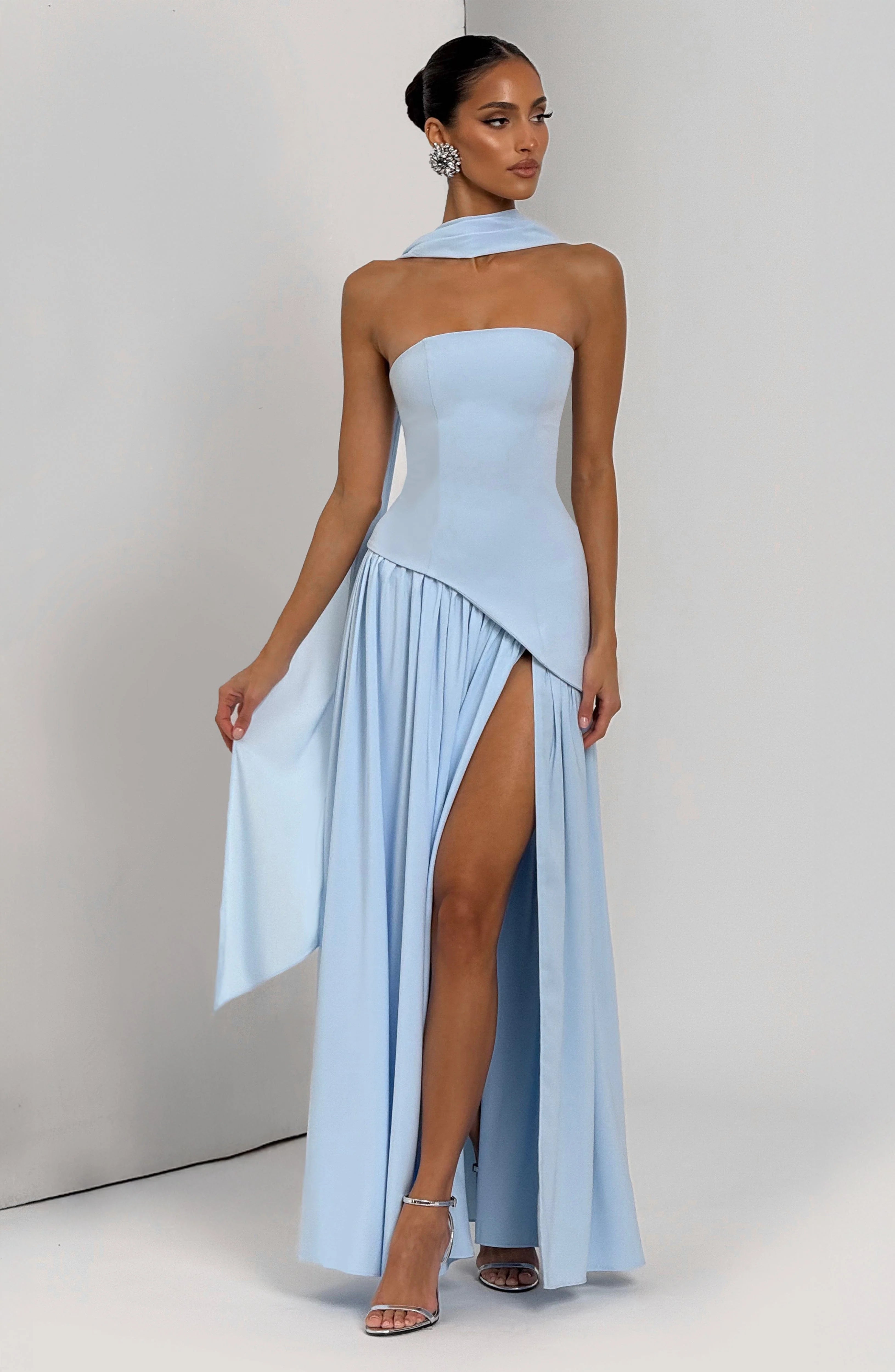 The Maliyah Maxi Dress in baby blue features a fitted crepe bodice with an asymmetrical hem and lace-up back, paired with a flowing chiffon skirt. Its full, gathered design includes a thigh-high split, blending elegance with a modern edge.