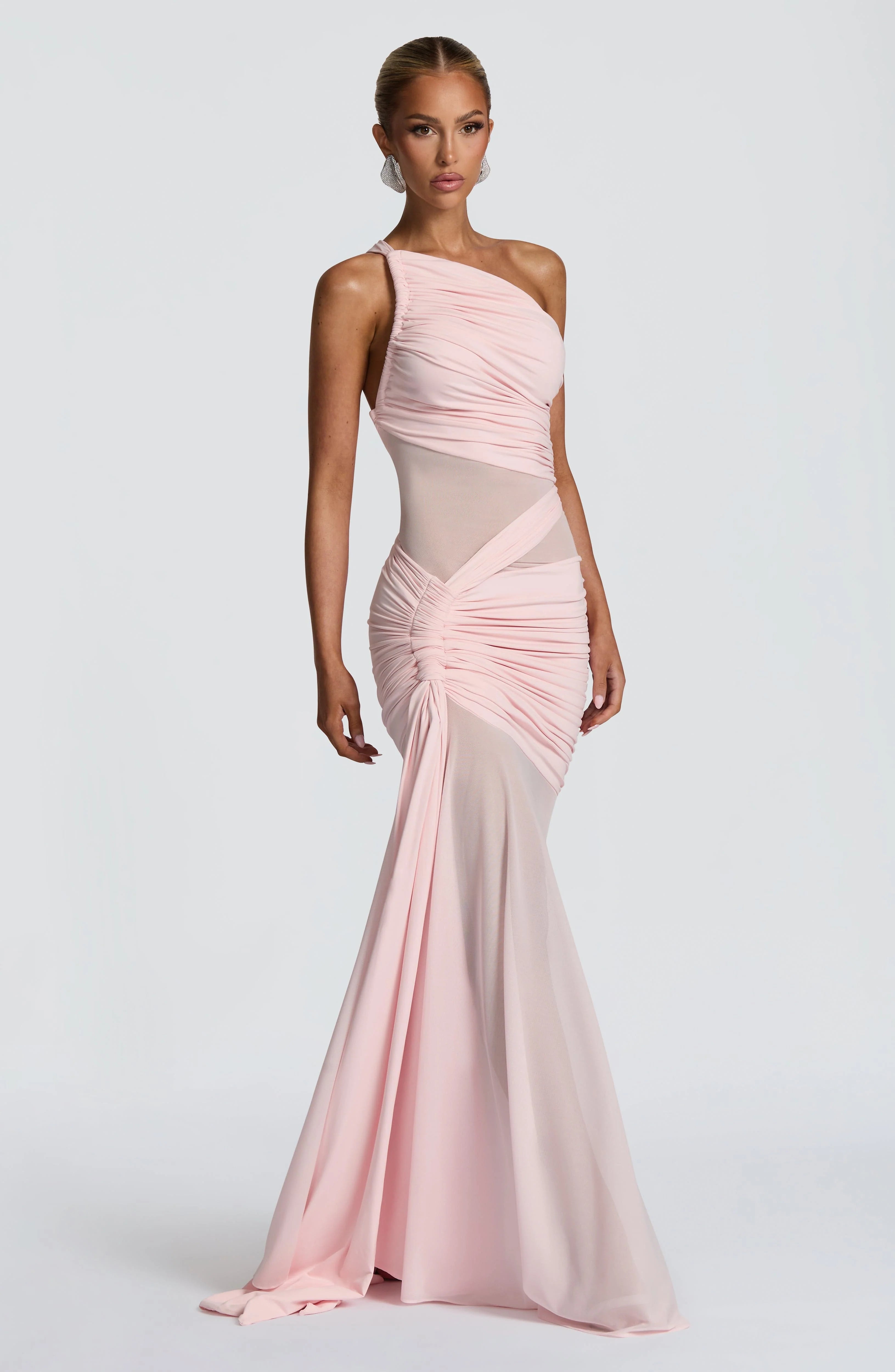 The Marianne Maxi Dress in blush features an elegant asymmetrical neckline with a functional channel and internal gripper tape for a secure fit. Crafted from slinky jersey and sheer mesh, it highlights a ruched asymmetric bust panel and a fitted hip silhouette that flows into a full, flared skirt with a dramatic drape panel.