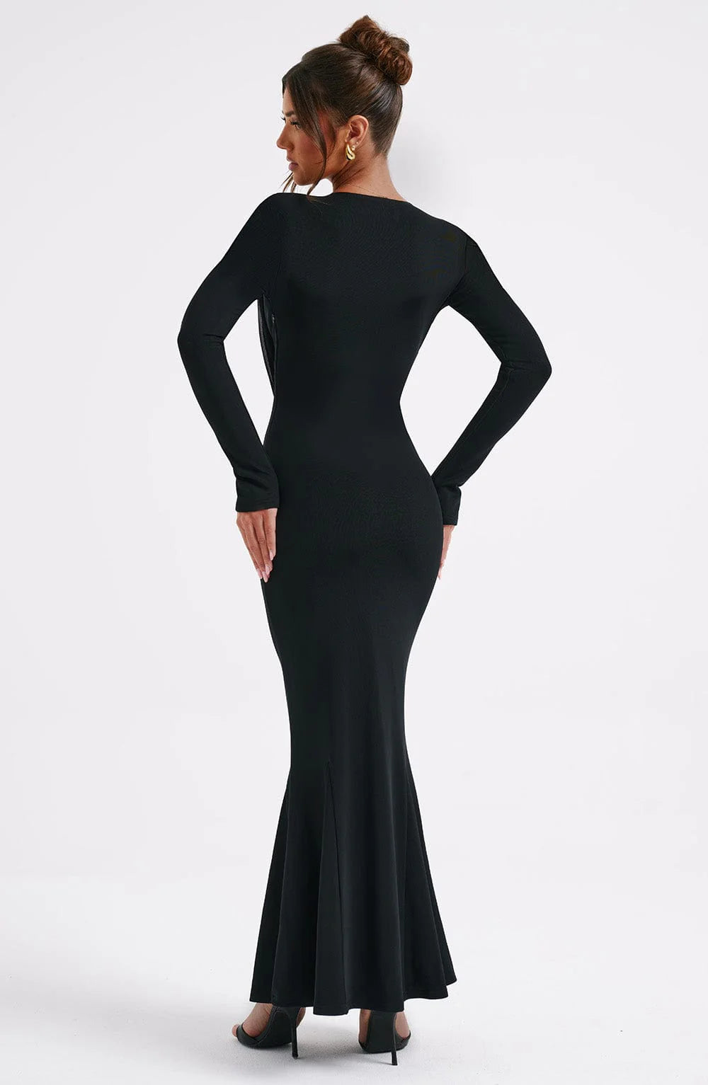 Made in a super flattering, body hugging fit, the Martina maxi is cut from our premium stretch mesh that gives you the silhouette of dreams. This long sleeve style is finished with a draped plunge neckline.