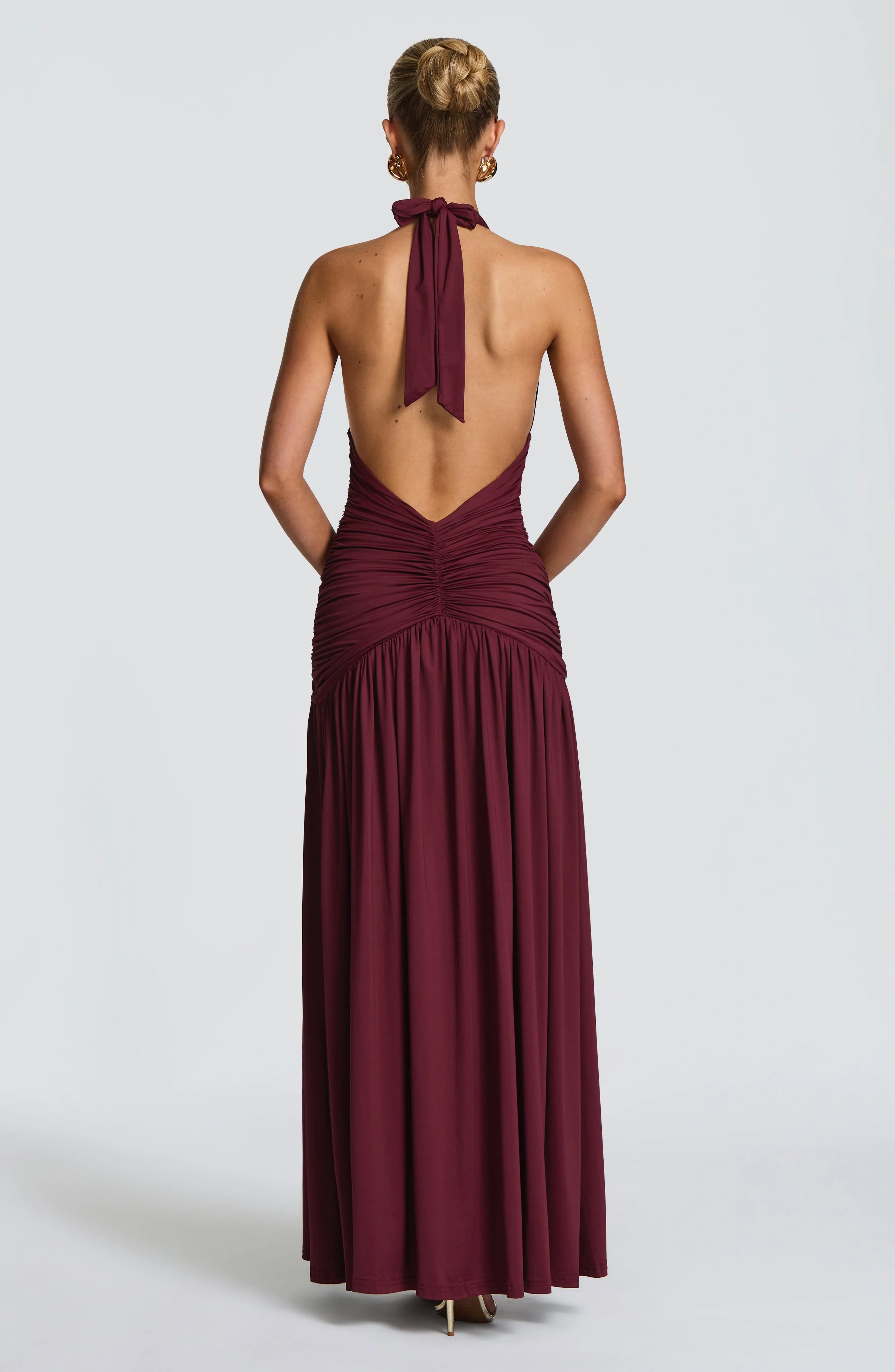We're obsessed with Melania, our brand new maxi dress that beautifully hugs your figure over the bust and hips, with a gentle shaped skirt. It stands out for it's sleek, sexy details, including a plunge halter neckline, self tie to the back of the neck and low v-shaped back. The maxi is complete with a thigh high split and ruched detailing.
