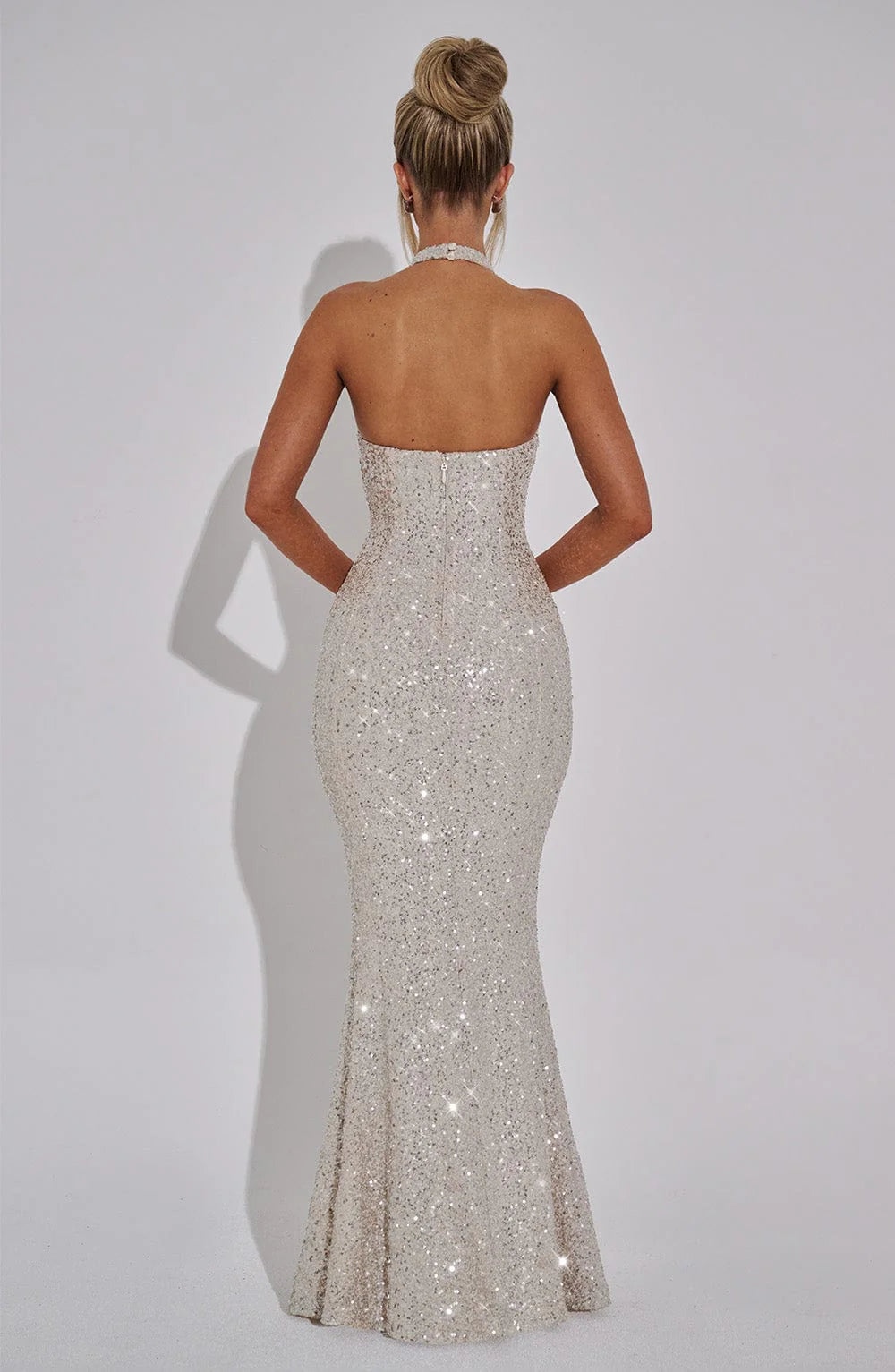 Get ready to light up the room in our Odette Maxi Dress in Champagne. The luxurious textured sequin fabric and fully lined design will have you feeling like a star. With a flattering plunge scoop neckline and body hugging fit, you'll turn heads all night long. The mermaid skirt adds a touch of elegance and the invisible zipper ensures a perfect fit.