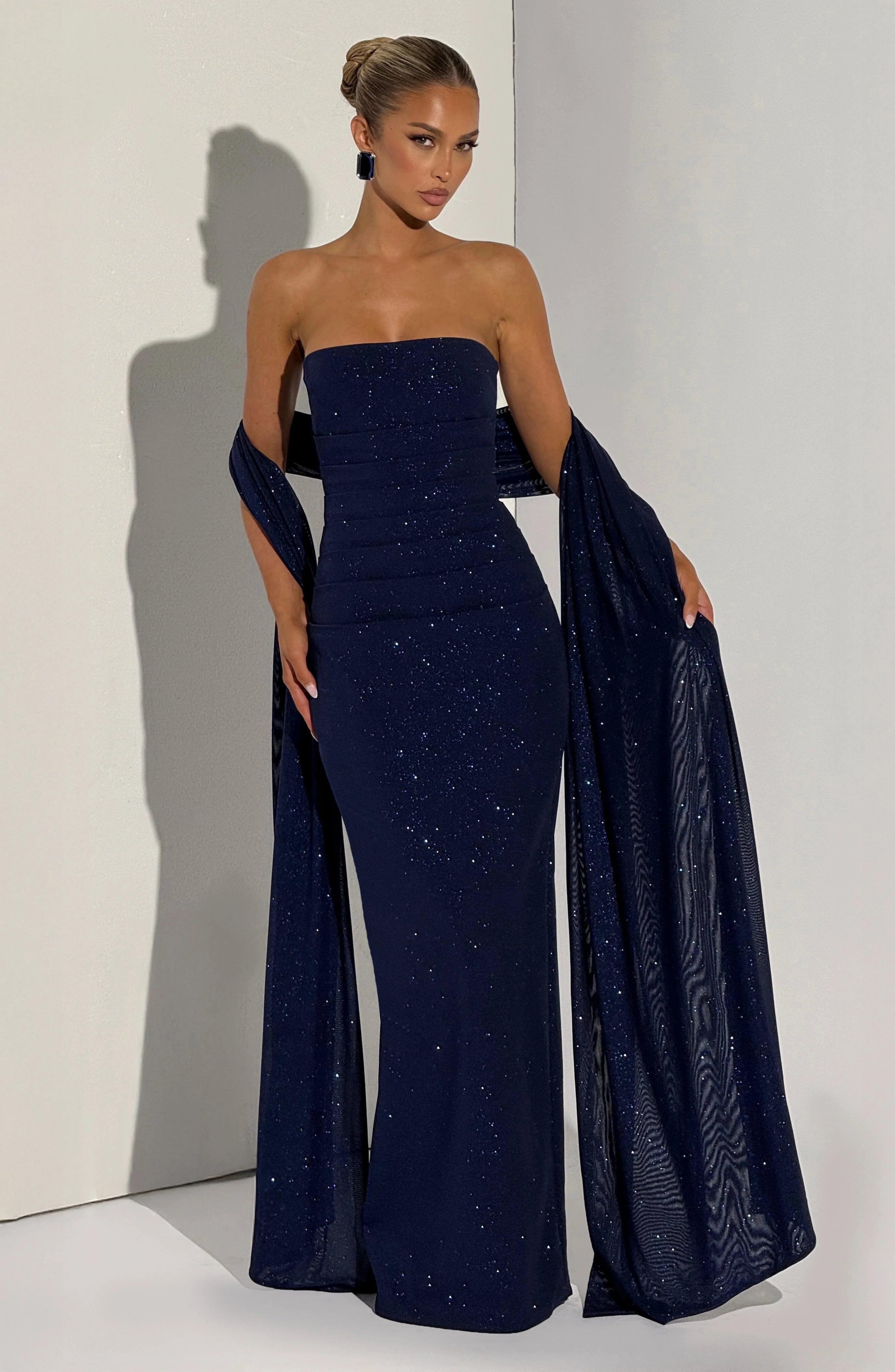 Elevate your evening with the Pandra Maxi Dress in Navy Sparkle. Crafted from non-stretch crepe with a subtle glitter finish, it features a strapless neckline, pleated bodice, and a sleek column skirt with a center back split for graceful movement.