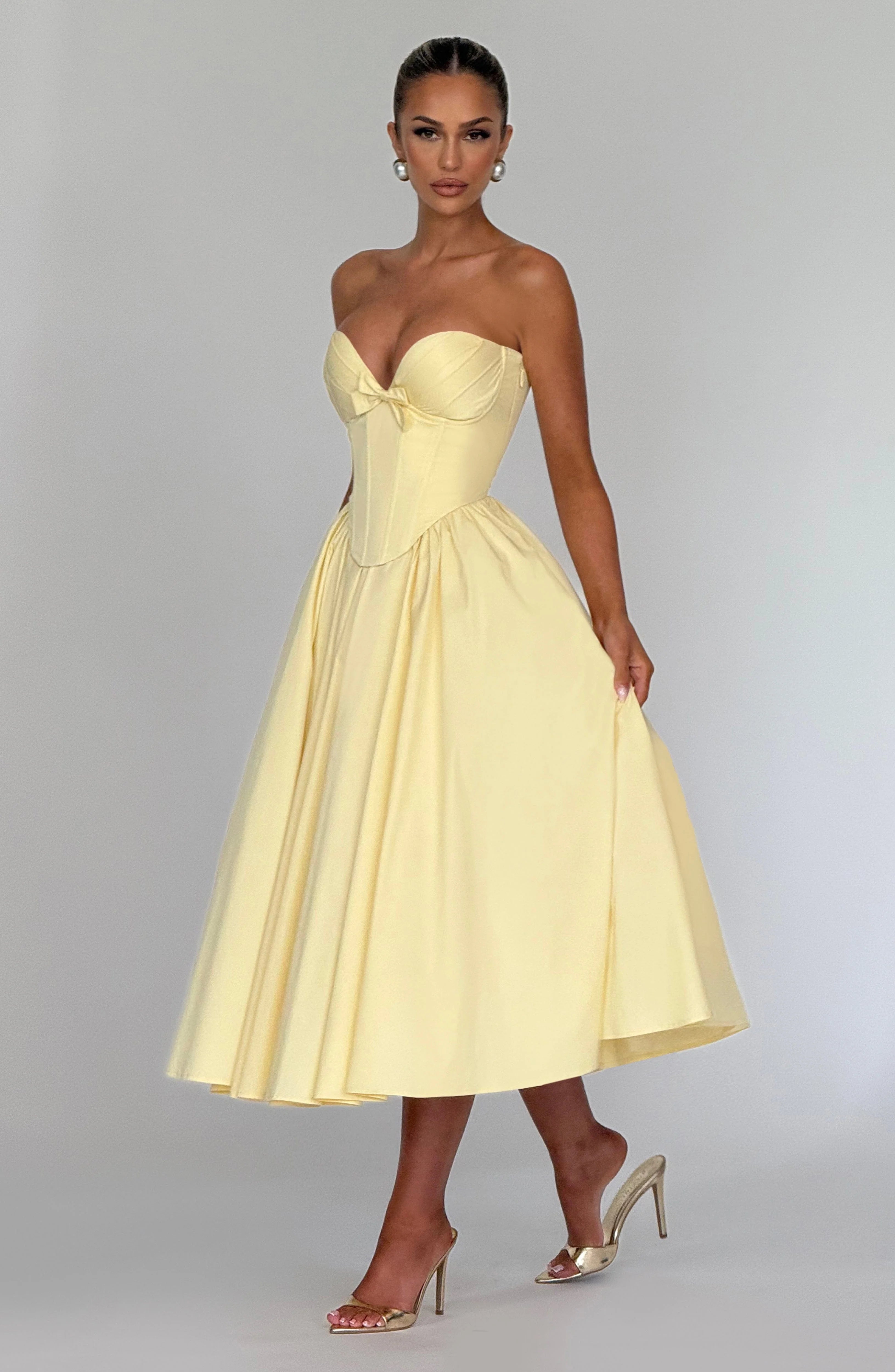 Indulge in the luxurious Prim Midi Dress in vibrant lemon. This strapless sundress features a plunge sweetheart neckline and pleated, underwired cups for support. The corset overlay with boning and bow detail add a touch of sophistication, while the lace up back allows for a perfect fit. The full, voluminous skirt with tulle lining adds an elegant and flirty element to this exquisite piece.