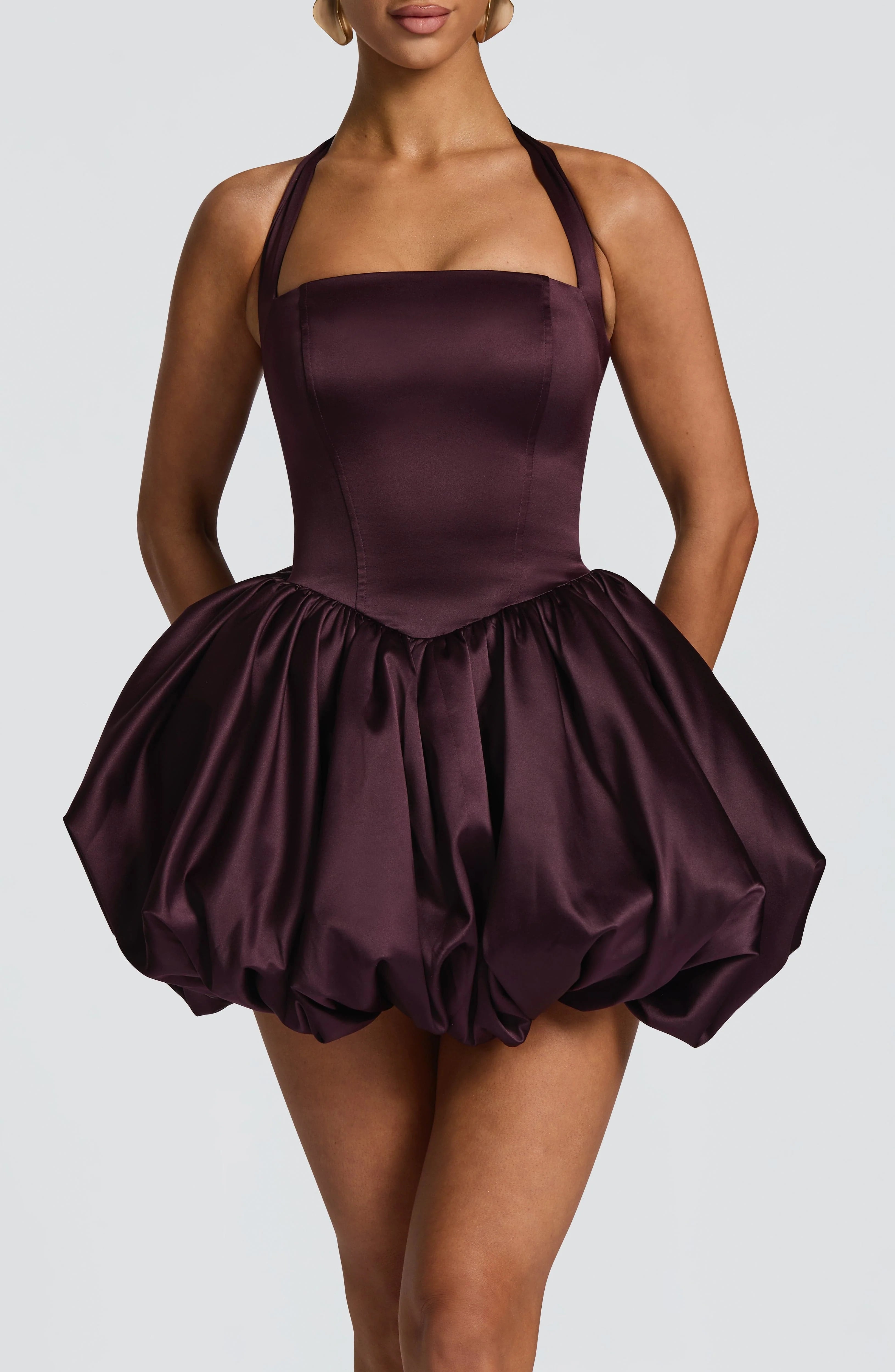 The Prudence Mini Dress in plum features a luxurious satin fabric with a chic square halter neckline and a playful puffball skirt. Its mini length and shirred lace-up back add a refined yet flirty touch, perfect for elegant occasions.
