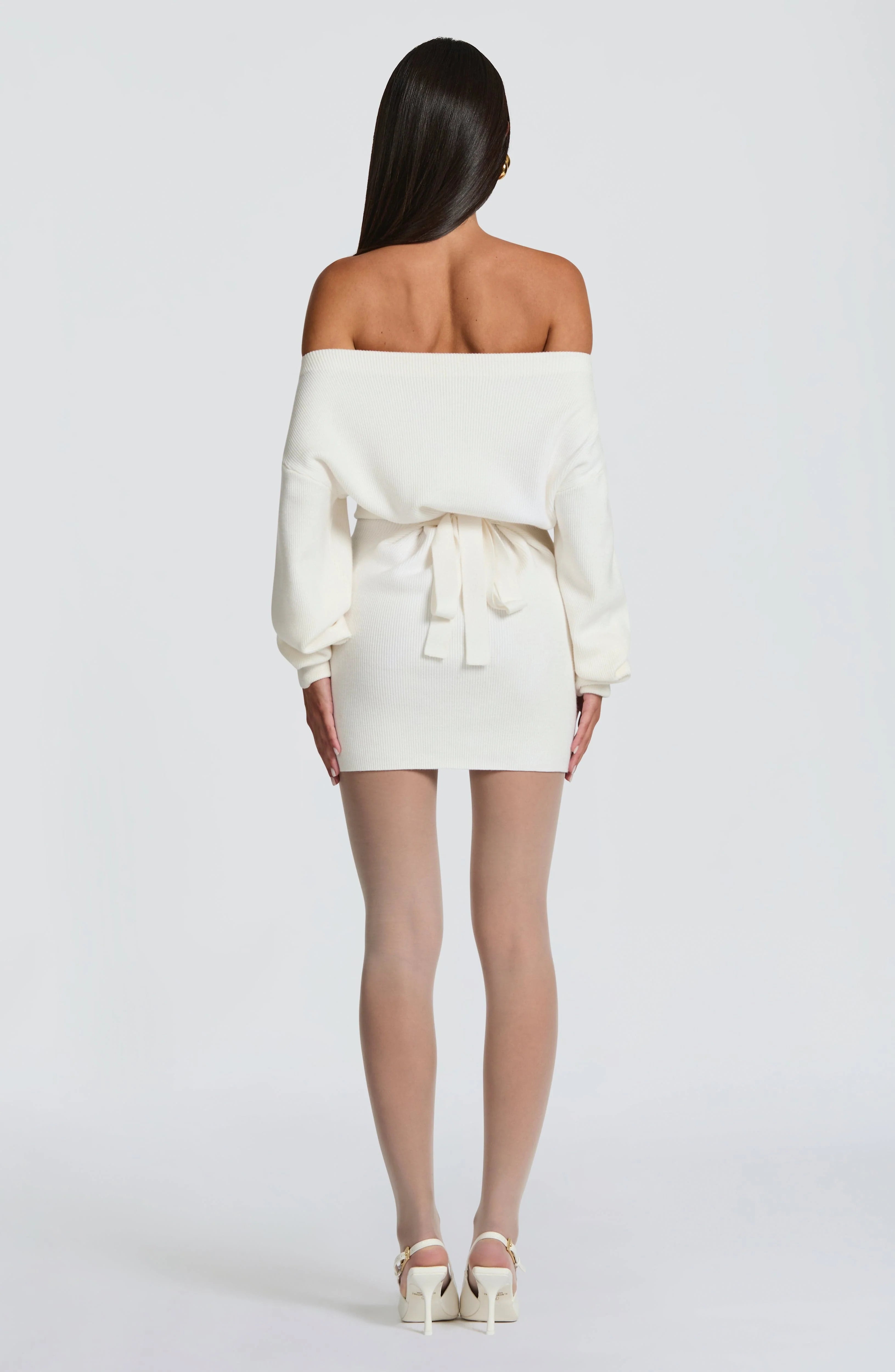 The Sawyer Mini Dress in ivory features a ribbed knit fabric with a chic Bardot neckline and voluminous long sleeves. Its tie-back waist creates a flattering silhouette, while the bodycon skirt adds an elegant, modern touch.