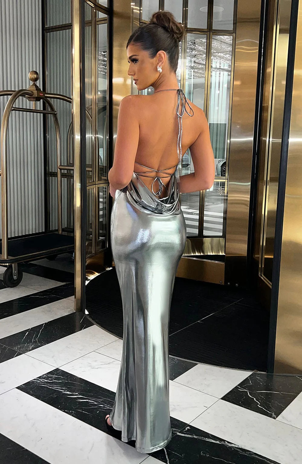 Talisa is the kind of dress you'll want to wear for special date nights, parties and champagne with the girls. Made from our premium metallic jersey, it hugs the body and falls elegantly, with a floor sweeping maxi length. A show stopping low back is framed by tie straps, while the front is finished with a cowl neck to compliment the bust and decolletage perfectly.