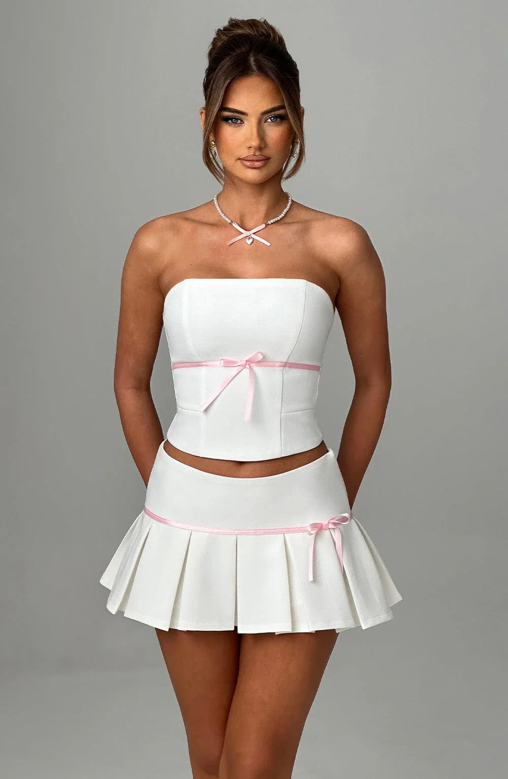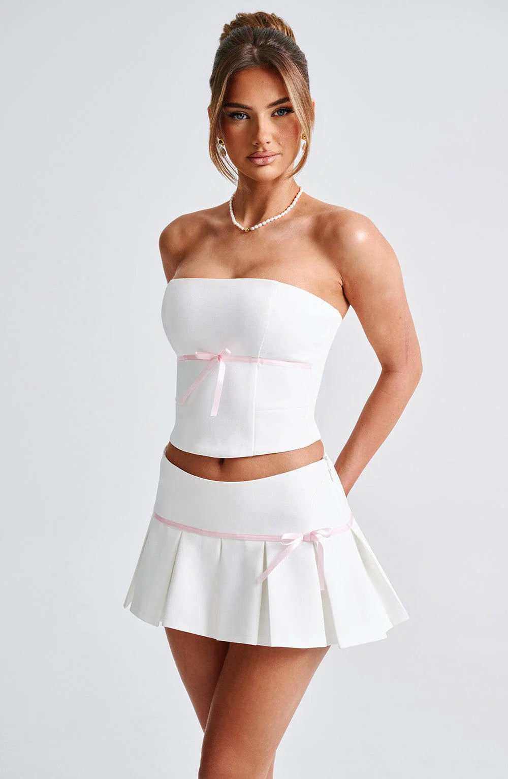 All eyes on you, boo. The Tessa skort is playful, fun, and looks amazing paired with our Anya top or a cute corset. This fully lined design has in-built shorts with a skirt overlay that's gathered for added volume. It has a mid-rise fit and is finished with a pretty lace trim to the hem.