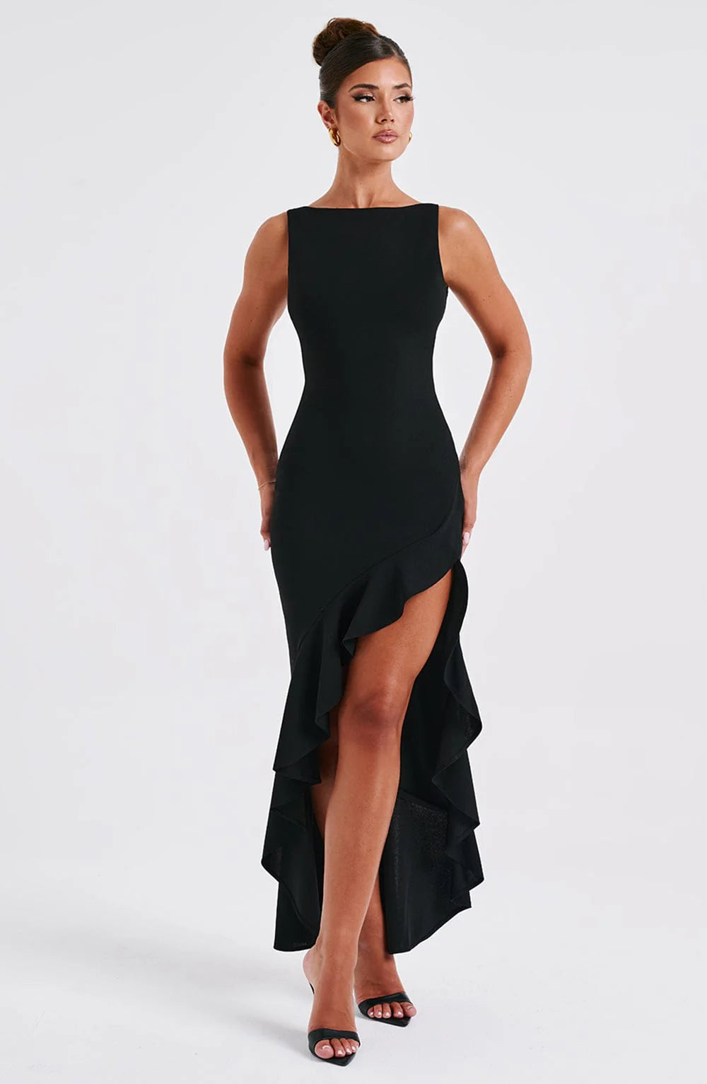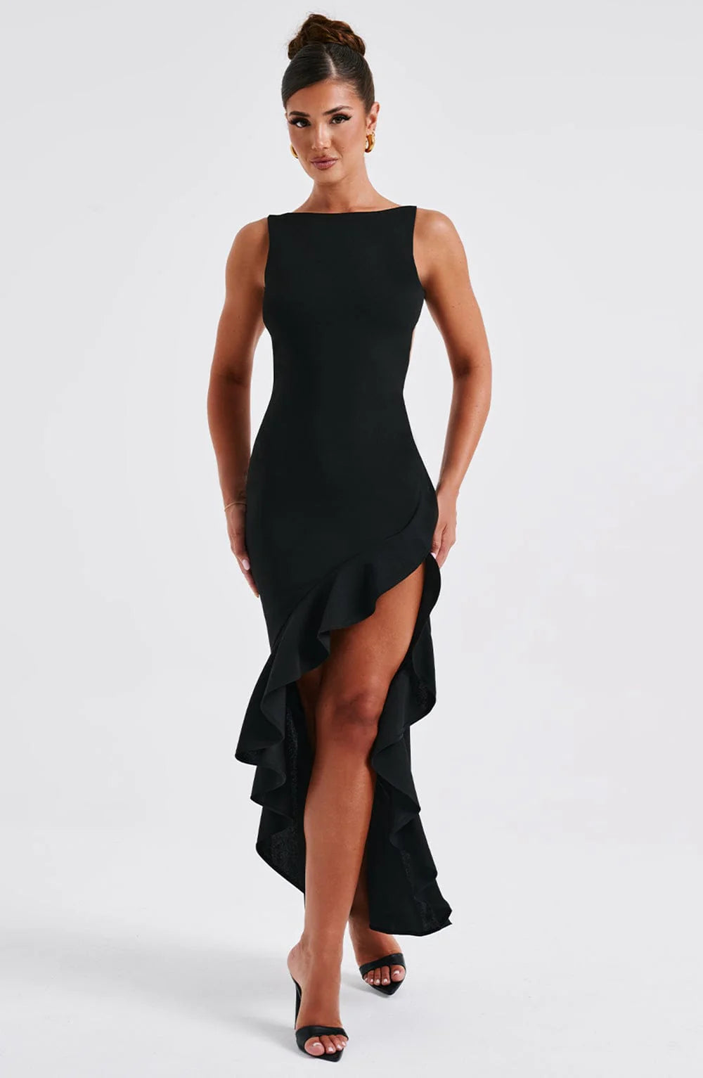 The Theodora maxi was made for special events, parties and late nights. Crafted in our premium double stretch crepe which moulds to your figure, this high neck dress features a super low back with delicate mesh panels and a double frill detail skirt. Wear yours with sleek, straight hair and silver jewellery.