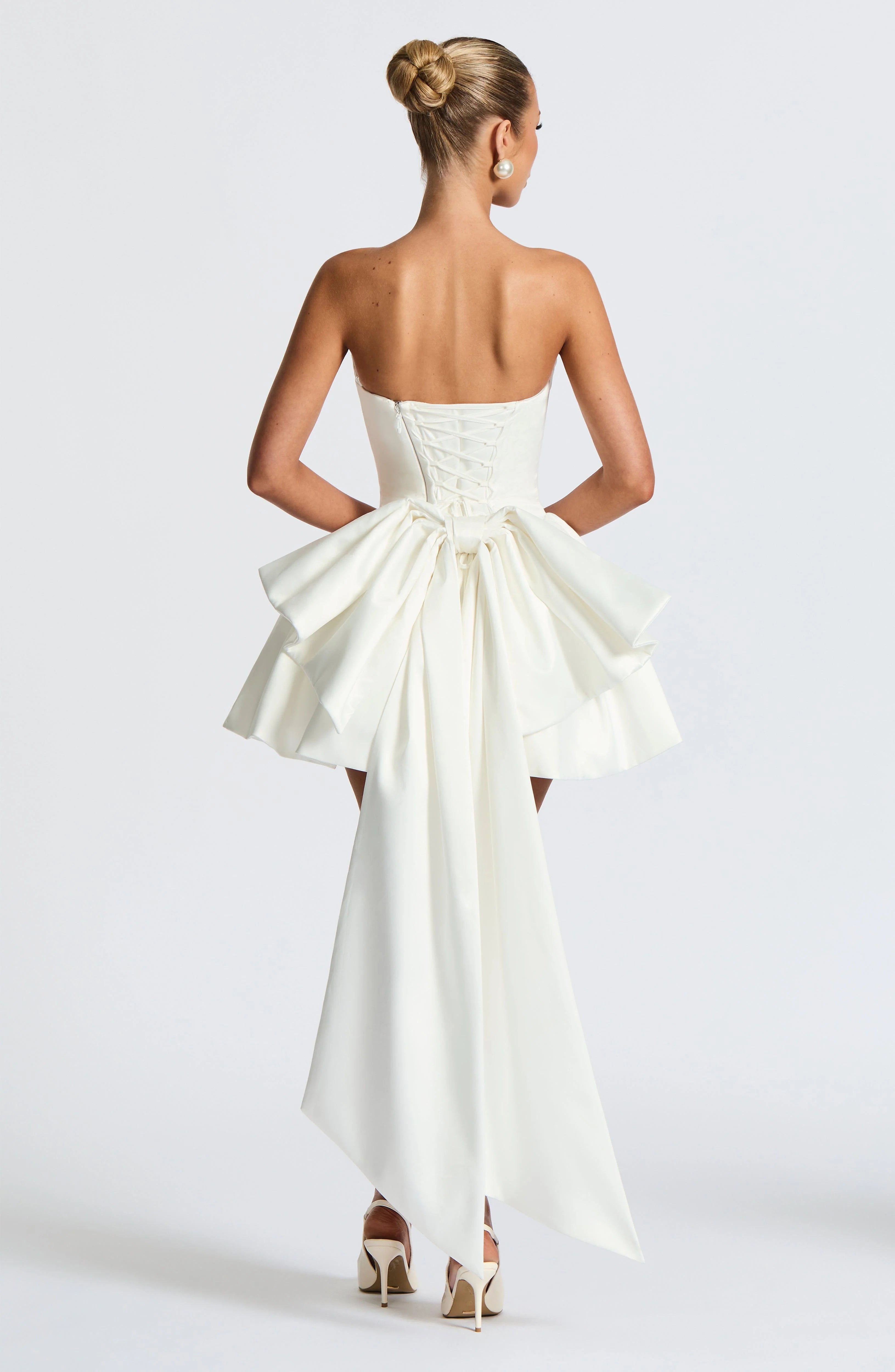 The Trinity Mini Dress in ivory is the perfect blend of elegance and fun. Its stretch satin fabric and boning in the bodice provide a flattering fit, while the full skirt and pleated godet panels add playful movement. The detachable bow with long tails on the back adds a quirky touch to this strapless dress with a scooped cowl neckline and lace up back.