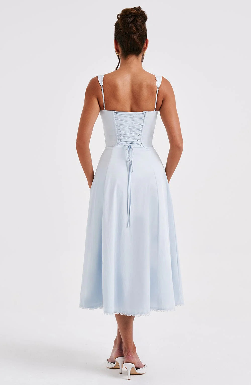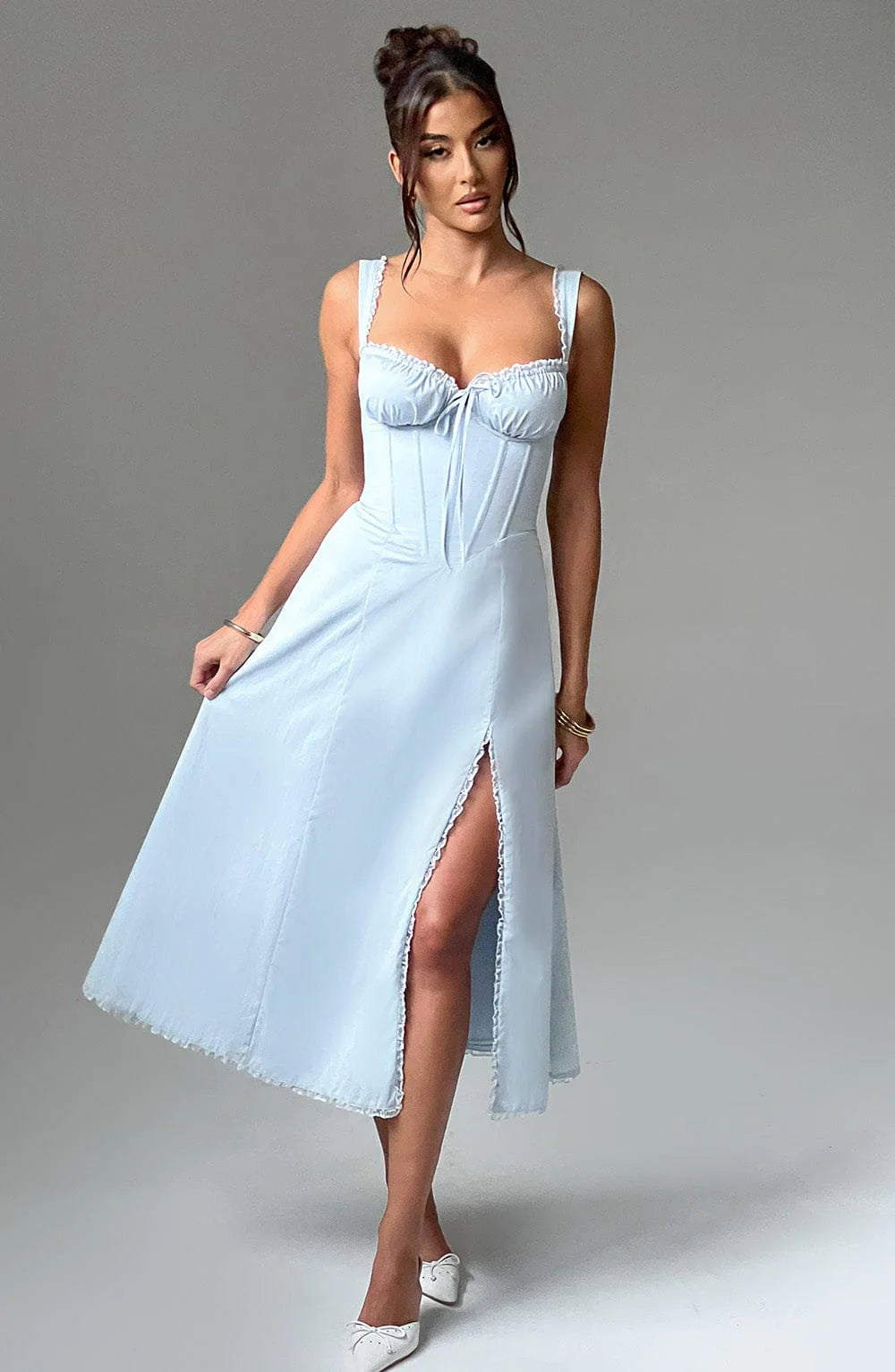 Must-have milkmaid midis are what we're wearing ALL season with sleek waves and mule heels. Ulrika has underwired cups, fan shape straps and a boned corset for a snatched waist. With a lace up back to make this extra figure flattering, it's complemented with a full skirt and thigh high split.