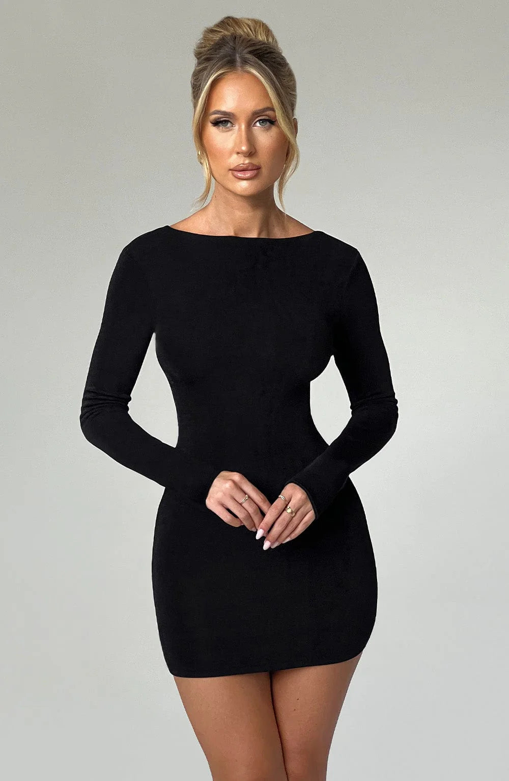 Say hello to the mini of the moment, Una. Crafted in our sleek, high shine fabric that snatches the figure with a second skin fit, this long sleeve design is complete with a high neck and low cowled back with cross over tie detail.