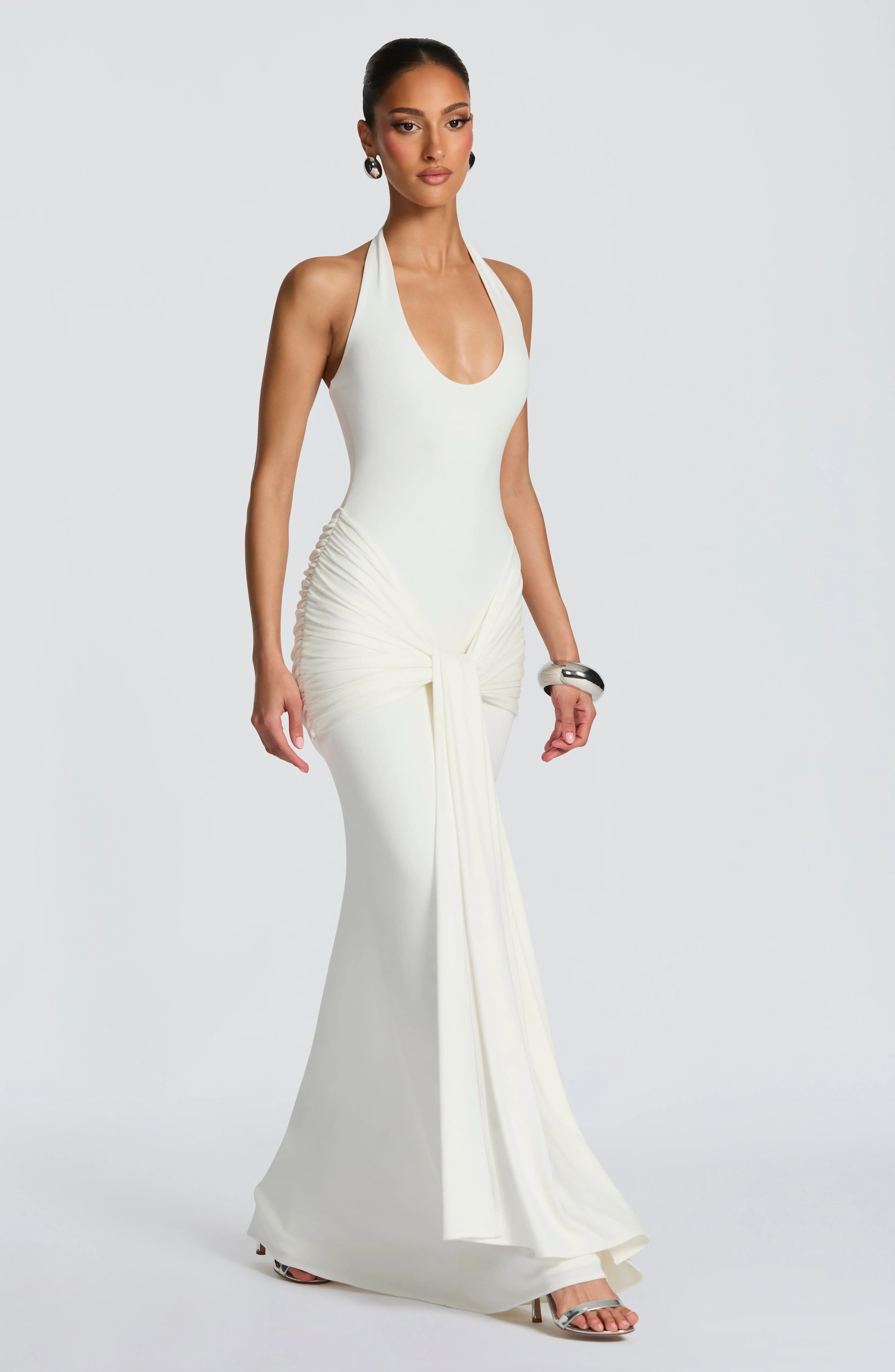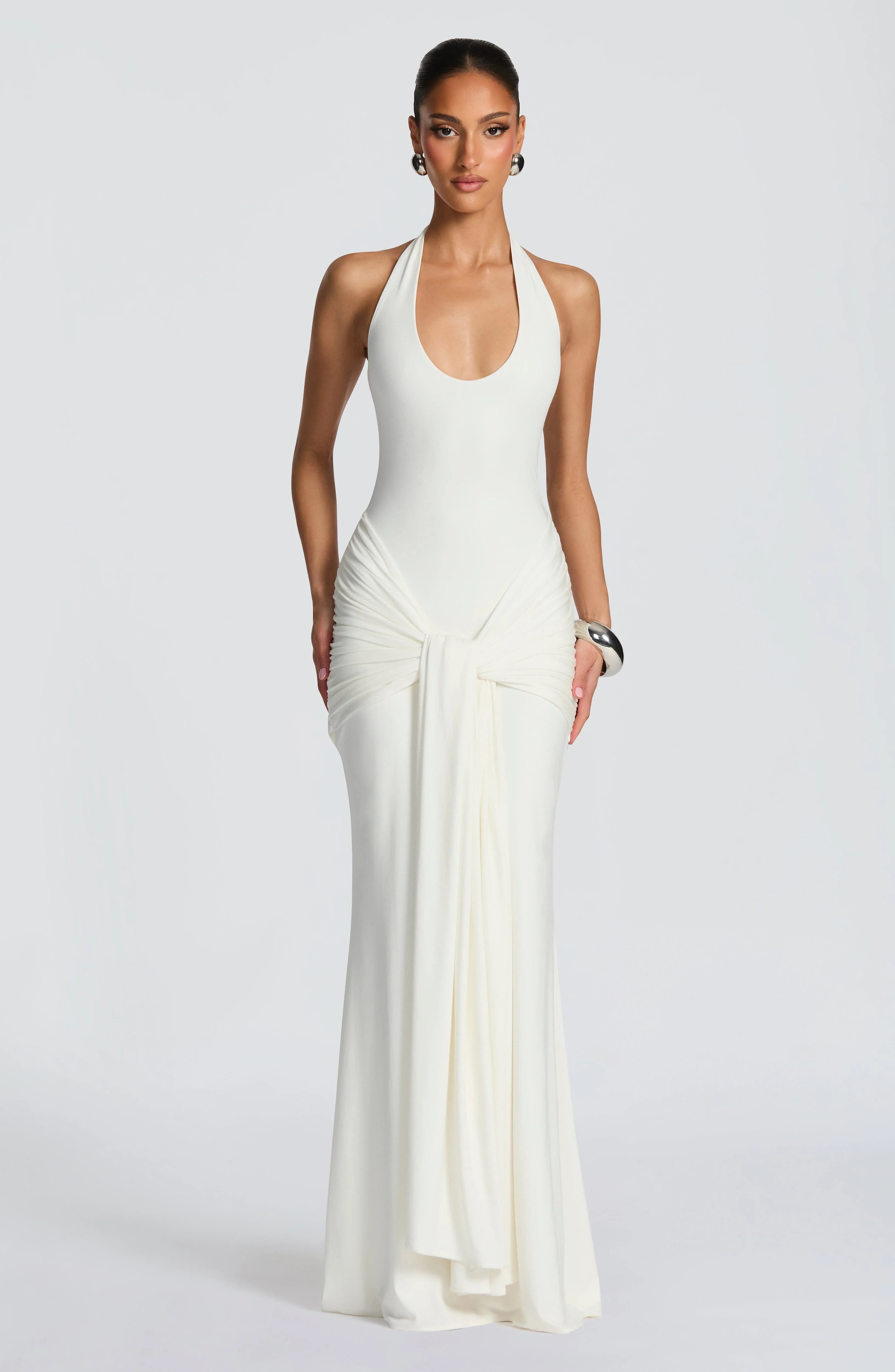 Refined elegance in ivory modal jersey. The Veneda Maxi Dress showcases a sculpted bodyhugging fit with a daring plunge neckline secured by halter ties, while a voluminous ruched panel across the hips adds dimension and grace.