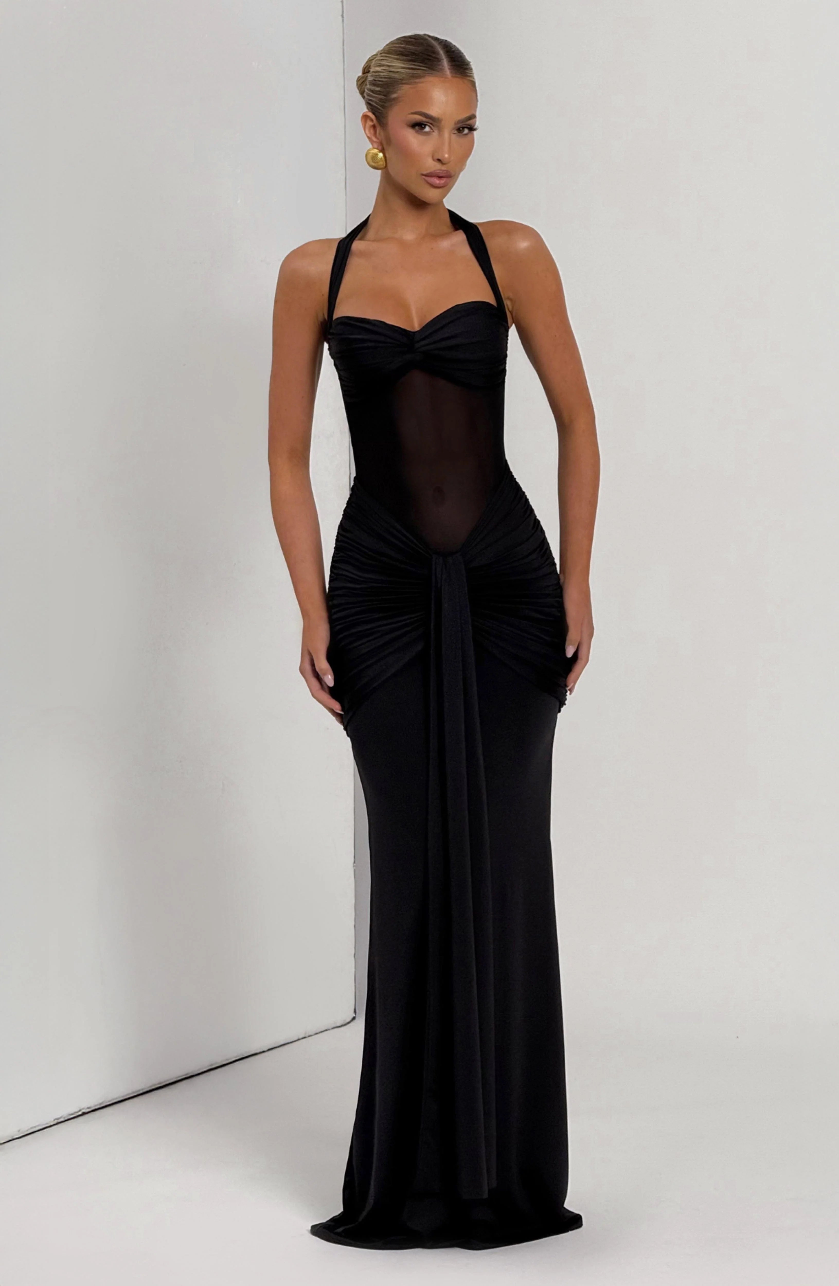 This elegant black maxi dress features a stretch slinky jersey and sheer mesh bodice with a sweetheart neckline and twist detail. The fitted ruched panel accentuates the hips, while the fit-and-flare skirt flows gracefully. Halter ties and a delicate front tie add refined touches, all without the need for a zipper.