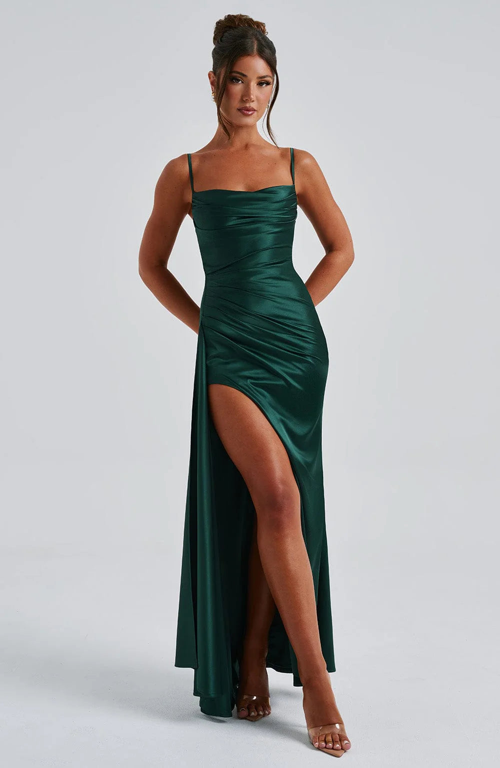 All eyes on you in Winona, the only design to dress you for every event this season. Crafted from our luxe stretch satin with a beatiful shine, this maxi hugs your figure for the silhouette of dreams. It's complete with a flattering cowl neckline, asymmetric pleats to the body and a draped thigh high split to show a little bit of leg.